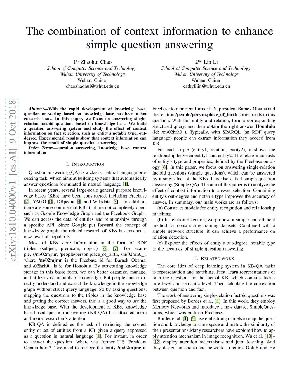 With the rapid development of knowledge base,question answering based on knowledge base has been a hot research issue. In this paper, we focus on answering singlerelation factoid questions based on knowledge base. We build a question answering system and study the effect of context information on fact selection, such as entity's notable type,outdegree. Experimental results show that context information can improve the result of simple question answering.