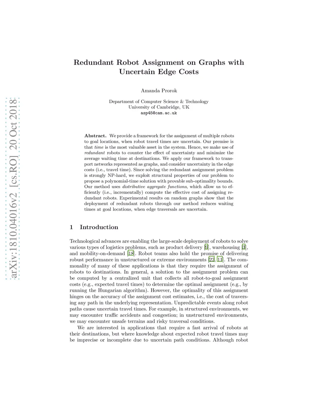 We provide a framework for the assignment of multiple robots to goal locations, when robot travel times are uncertain. Our premise is that time is the most valuable asset in the system. Hence, we make use of redundant robots to counter the effect of uncertainty and minimize the average waiting time at destinations. We apply our framework to transport networks represented as graphs, and consider uncertainty in the edge costs (i.e., travel time). Since solving the redundant assignment problem is strongly NP-hard, we exploit structural properties of our problem to propose a polynomial-time solution with provable sub-optimality bounds. Our method uses distributive aggregate functions, which allow us to efficiently (i.e., incrementally) compute the effective cost of assigning redundant robots. Experimental results on random graphs show that the deployment of redundant robots through our method reduces waiting times at goal locations, when edge traversals are uncertain.