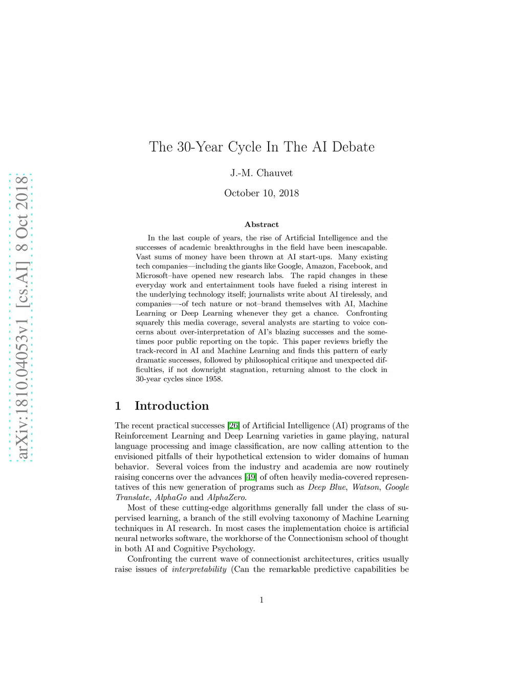 In the last couple of years, the rise of Artificial Intelligence and the successes of academic breakthroughs in the field have been inescapable. Vast sums of money have been thrown at AI start-ups. Many existing tech companies -- including the giants like Google, Amazon, Facebook, and Microsoft -- have opened new research labs. The rapid changes in these everyday work and entertainment tools have fueled a rising interest in the underlying technology itself; journalists write about AI tirelessly, and companies -- of tech nature or not -- brand themselves with AI, Machine Learning or Deep Learning whenever they get a chance. Confronting squarely this media coverage, several analysts are starting to voice concerns about over-interpretation of AI's blazing successes and the sometimes poor public reporting on the topic. This paper reviews briefly the track-record in AI and Machine Learning and finds this pattern of early dramatic successes, followed by philosophical critique and unexpected difficulties, if not downright stagnation, returning almost to the clock in 30-year cycles since 1958.