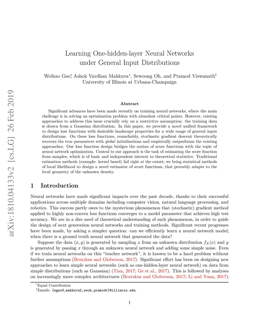 Significant advances have been made recently on training neural networks, where the main challenge is in solving an optimization problem with abundant critical points. However, existing approaches to address this issue crucially rely on a restrictive assumption: the training data is drawn from a Gaussian distribution. In this paper, we provide a novel unified framework to design loss functions with desirable landscape properties for a wide range of general input distributions. On these loss functions, remarkably, stochastic gradient descent theoretically recovers the true parameters with global initializations and empirically outperforms the existing approaches. Our loss function design bridges the notion of score functions with the topic of neural network optimization. Central to our approach is the task of estimating the score function from samples, which is of basic and independent interest to theoretical statistics. Traditional estimation methods (example: kernel based) fail right at the outset; we bring statistical methods of local likelihood to design a novel estimator of score functions, that provably adapts to the local geometry of the unknown density.