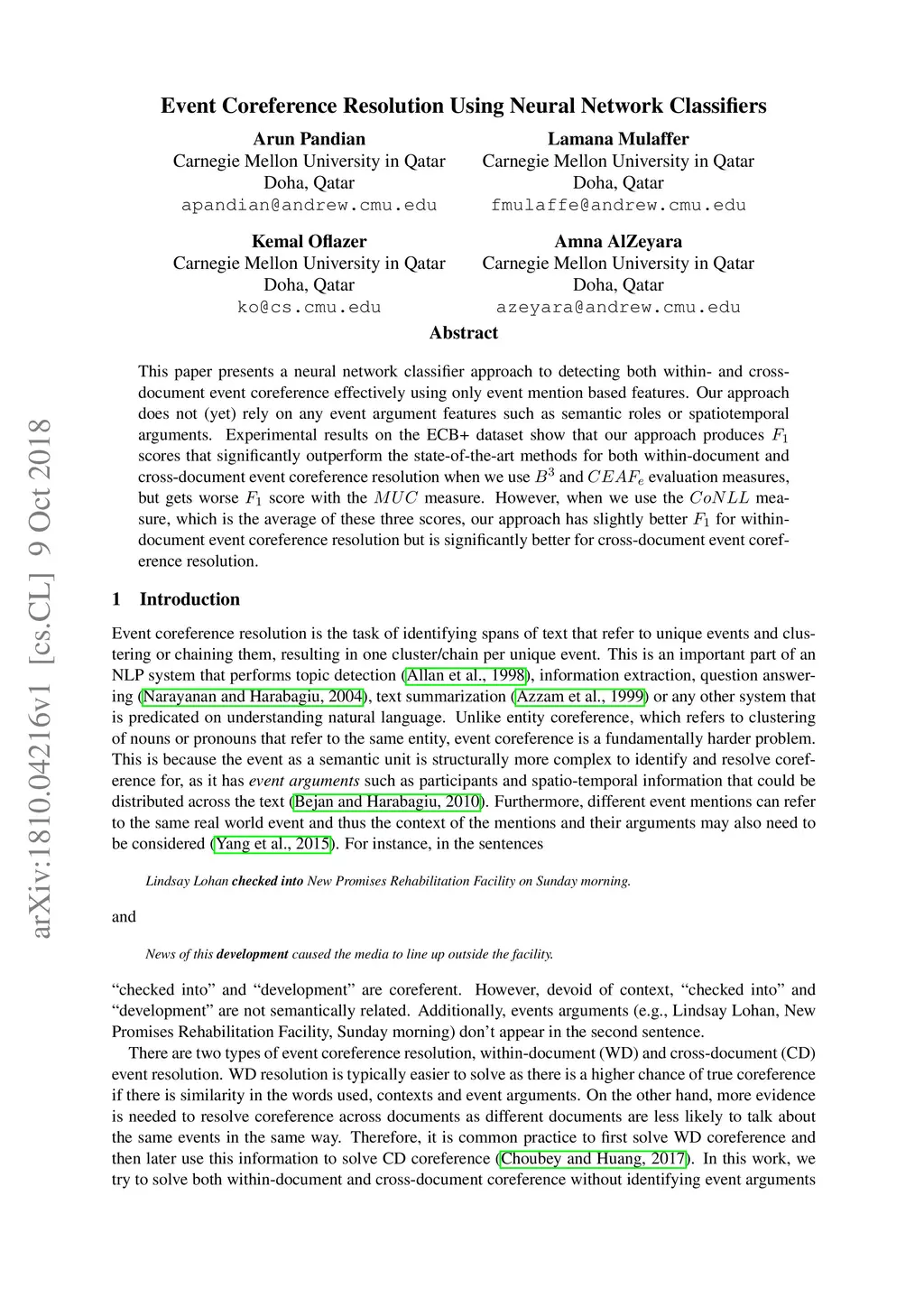 This paper presents a neural network classifier approach to detecting both within- and cross- document event coreference effectively using only event mention based features. Our approach does not (yet) rely on any event argument features such as semantic roles or spatiotemporal arguments. Experimental results on the ECB+ dataset show that our approach produces F1 scores that significantly outperform the state-of-the-art methods for both within-document and cross-document event coreference resolution when we use B3 and CEAFe evaluation measures, but gets worse F1 score with the MUC measure. However, when we use the CoNLL measure, which is the average of these three scores, our approach has slightly better F1 for within- document event coreference resolution but is significantly better for cross-document event coreference resolution.