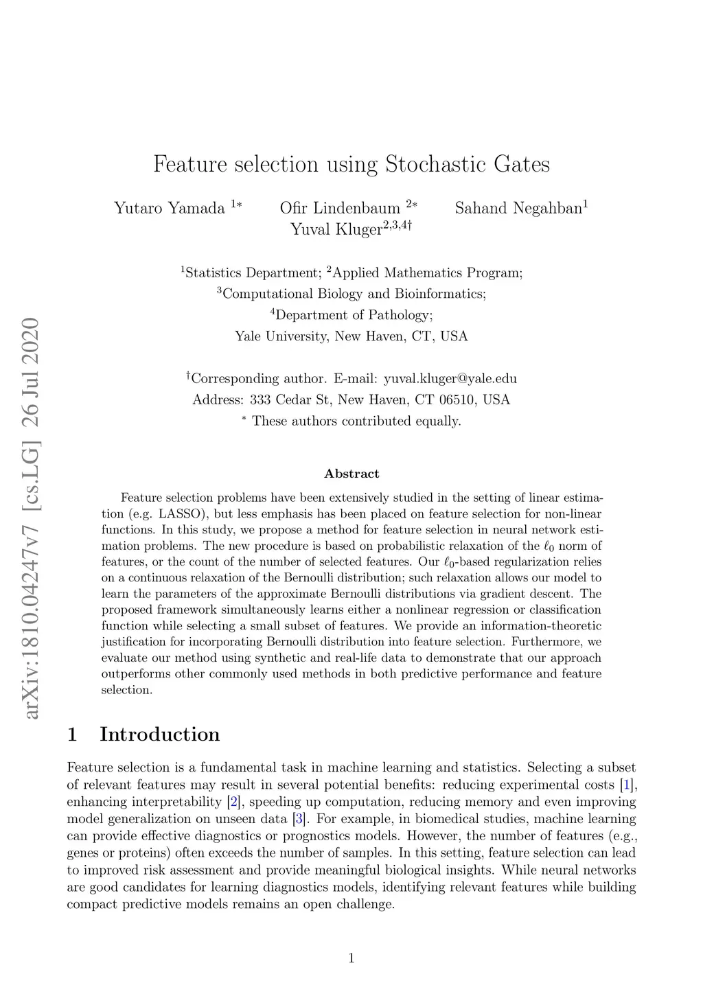 Feature selection problems have been extensively studied for linear estimation, for instance, Lasso, but less emphasis has been placed on feature selection for non-linear functions. In this study, we propose a method for feature selection in high-dimensional non-linear function estimation problems. The new procedure is based on minimizing the norm of the vector of indicator variables that represent if a feature is selected or not. Our approach relies on the continuous relaxation of Bernoulli distributions, which allows our model to learn the parameters of the approximate Bernoulli distributions via gradient descent. This general framework simultaneously minimizes a loss function while selecting relevant features. Furthermore, we provide an information-theoretic justification of incorporating Bernoulli distribution into our approach and demonstrate the potential of the approach on synthetic and real-life applications.