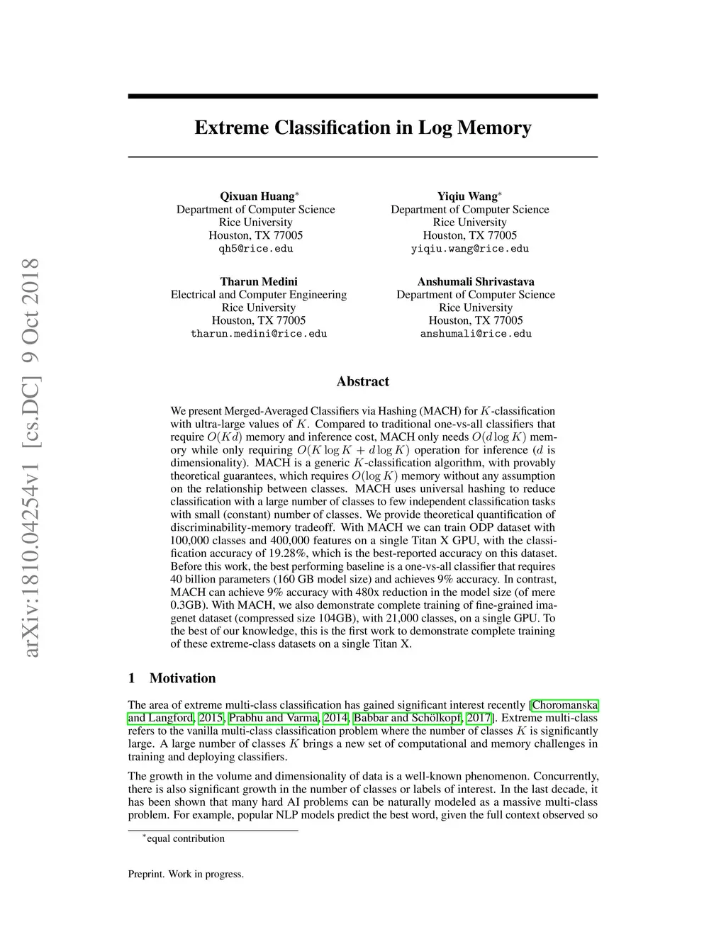 We present Merged-Averaged Classifiers via Hashing (MACH) for K-classification with ultra-large values of K. Compared to traditional one-vs-all classifiers that require O(Kd) memory and inference cost, MACH only need O(d log K) (d is dimensionality )memory while only requiring O(K log K + d log K) operation for inference. MACH is a generic K-classification algorithm, with provably theoretical guarantees, which requires O(log K) memory without any assumption on the relationship between classes. MACH uses universal hashing to reduce classification with a large number of classes to few independent classification tasks with small (constant) number of classes. We provide theoretical quantification of discriminability-memory tradeoff. With MACH we can train ODP dataset with 100,000 classes and 400,000 features on a single Titan X GPU, with the classification accuracy of 19.28%, which is the best-reported accuracy on this dataset. Before this work, the best performing baseline is a one-vs-all classifier that requires 40 billion parameters (160 GB model size) and achieves 9% accuracy. In contrast, MACH can achieve 9% accuracy with 480x reduction in the model size (of mere 0.3GB). With MACH, we also demonstrate complete training of fine-grained imagenet dataset (compressed size 104GB), with 21,000 classes, on a single GPU. To the best of our knowledge, this is the first work to demonstrate complete training of these extreme-class datasets on a single Titan X.