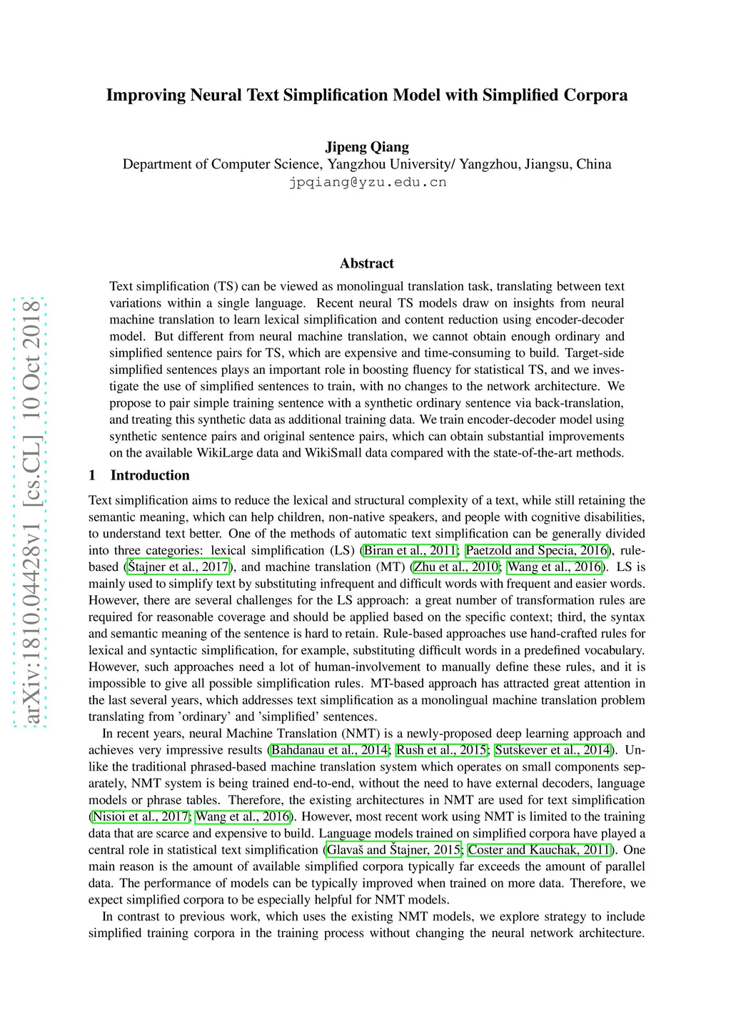 Text simplification (TS) can be viewed as monolingual translation task, translating between text variations within a single language. Recent neural TS models draw on insights from neural machine translation to learn lexical simplification and content reduction using encoder-decoder model. But different from neural machine translation, we cannot obtain enough ordinary and simplified sentence pairs for TS, which are expensive and time-consuming to build. Target-side simplified sentences plays an important role in boosting fluency for statistical TS, and we investigate the use of simplified sentences to train, with no changes to the network architecture. We propose to pair simple training sentence with a synthetic ordinary sentence via back-translation, and treating this synthetic data as additional training data. We train encoder-decoder model using synthetic sentence pairs and original sentence pairs, which can obtain substantial improvements on the available WikiLarge data and WikiSmall data compared with the state-of-the-art methods.