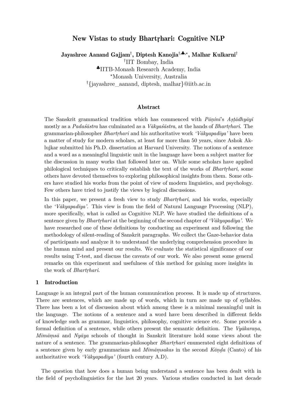 The Sanskrit grammatical tradition which has commenced with Panini's Astadhyayi mostly as a Padasastra has culminated as a Vakyasastra, at the hands of Bhartrhari. The grammarian-philosopher Bhartrhari and his authoritative work 'Vakyapadiya' have been a matter of study for modern scholars, at least for more than 50 years, since Ashok Aklujkar submitted his Ph.D. dissertation at Harvard University. The notions of a sentence and a word as a meaningful linguistic unit in the language have been a subject matter for the discussion in many works that followed later on. While some scholars have applied philological techniques to critically establish the text of the works of Bhartrhari, some others have devoted themselves to exploring philosophical insights from them. Some others have studied his works from the point of view of modern linguistics, and psychology. Few others have tried to justify the views by logical discussions. In this paper, we present a fresh view to study Bhartrhari, and his works, especially the 'Vakyapadiya'. This view is from the field of Natural Language Processing (NLP), more specifically, what is called as Cognitive NLP. We have studied the definitions of a sentence given by Bhartrhari at the beginning of the second chapter of 'Vakyapadiya'. We have researched one of these definitions by conducting an experiment and following the methodology of silent-reading of Sanskrit paragraphs. We collect the Gaze-behavior data of participants and analyze it to understand the underlying comprehension procedure in the human mind and present our results. We evaluate the statistical significance of our results using T-test, and discuss the caveats of our work. We also present some general remarks on this experiment and usefulness of this method for gaining more insights in the work of Bhartrhari.