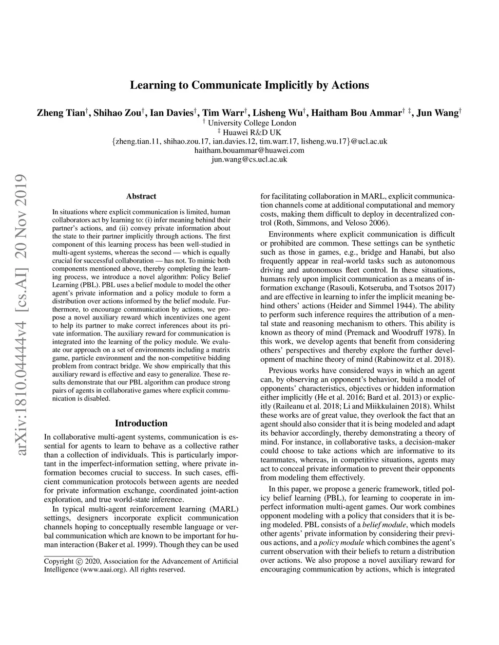 In situations where explicit communication is limited, human collaborators act by learning to: (i) infer meaning behind their partner's actions, and (ii) convey private information about the state to their partner implicitly through actions. The first component of this learning process has been well-studied in multi-agent systems, whereas the second --- which is equally crucial for successful collaboration --- has not. To mimic both components mentioned above, thereby completing the learning process, we introduce a novel algorithm: Policy Belief Learning (PBL). PBL uses a belief module to model the other agent's private information and a policy module to form a distribution over actions informed by the belief module. Furthermore, to encourage communication by actions, we propose a novel auxiliary reward which incentivizes one agent to help its partner to make correct inferences about its private information. The auxiliary reward for communication is integrated into the learning of the policy module. We evaluate our approach on a set of environments including a matrix game, particle environment and the non-competitive bidding problem from contract bridge. We show empirically that this auxiliary reward is effective and easy to generalize. These results demonstrate that our PBL algorithm can produce strong pairs of agents in collaborative games where explicit communication is disabled.