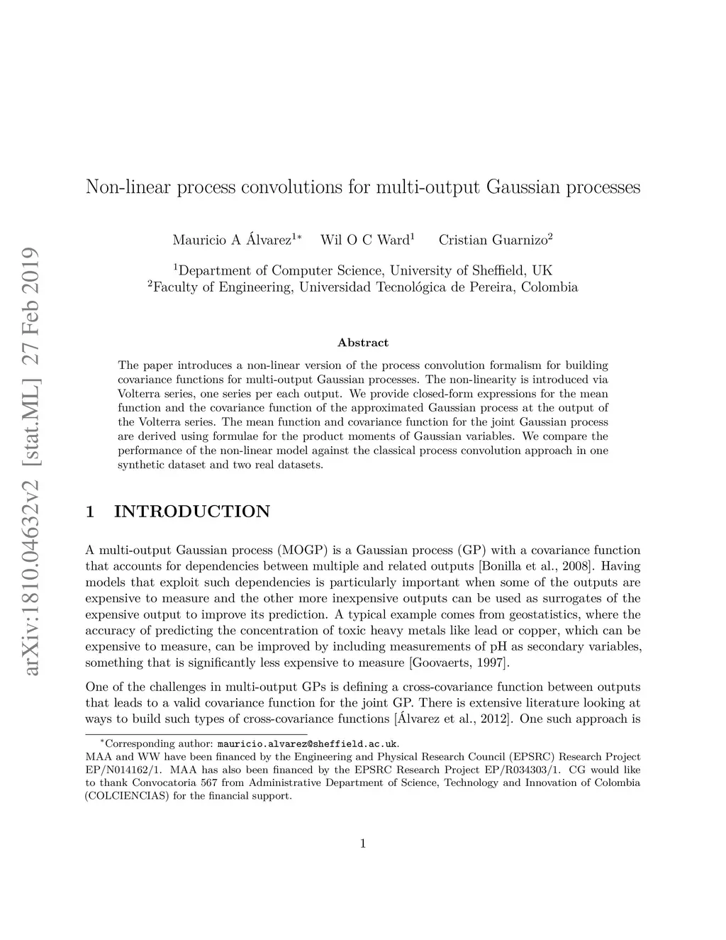 The paper introduces a non-linear version of the process convolution formalism for building covariance functions for multi-output Gaussian processes. The non-linearity is introduced via Volterra series, one series per each output. We provide closed-form expressions for the mean function and the covariance function of the approximated Gaussian process at the output of the Volterra series. The mean function and covariance function for the joint Gaussian process are derived using formulae for the product moments of Gaussian variables. We compare the performance of the non-linear model against the classical process convolution approach in one synthetic dataset and two real datasets.