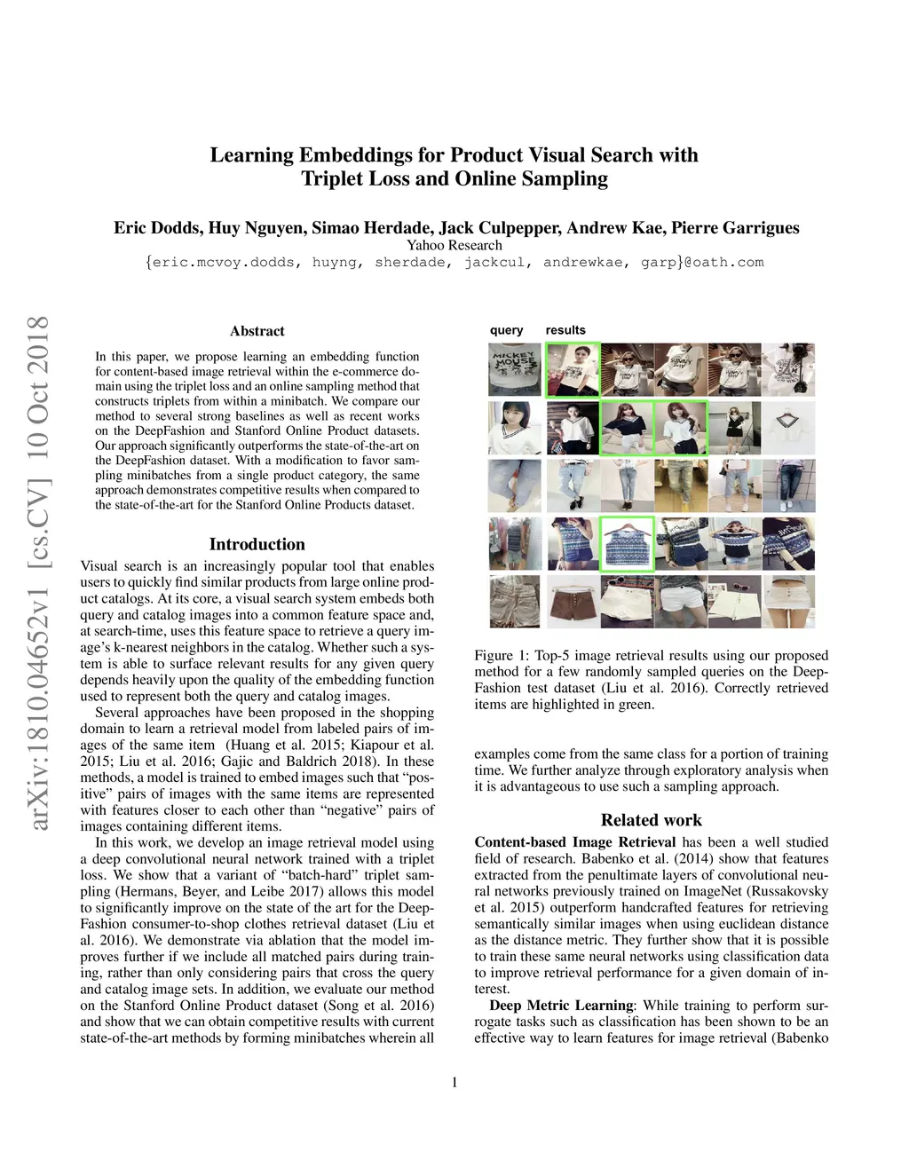 In this paper, we propose learning an embedding function for content-based image retrieval within the e-commerce domain using the triplet loss and an online sampling method that constructs triplets from within a minibatch. We compare our method to several strong baselines as well as recent works on the DeepFashion and Stanford Online Product datasets. Our approach significantly outperforms the state-of-the-art on the DeepFashion dataset. With a modification to favor sampling minibatches from a single product category, the same approach demonstrates competitive results when compared to the state-of-the-art for the Stanford Online Products dataset.