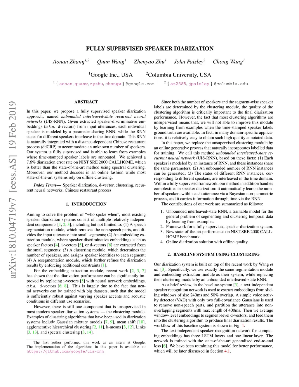 In this paper, we propose a fully supervised speaker diarization approach, named unbounded interleaved-state recurrent neural networks (UIS-RNN). Given extracted speaker-discriminative embeddings (a.k.a. d-vectors) from input utterances, each individual speaker is modeled by a parameter-sharing RNN, while the RNN states for different speakers interleave in the time domain. This RNN is naturally integrated with a distance-dependent Chinese restaurant process (ddCRP) to accommodate an unknown number of speakers. Our system is fully supervised and is able to learn from examples where time-stamped speaker labels are annotated. We achieved a 7.6% diarization error rate on NIST SRE 2000 CALLHOME, which is better than the state-of-the-art method using spectral clustering. Moreover, our method decodes in an online fashion while most state-of-the-art systems rely on offline clustering.