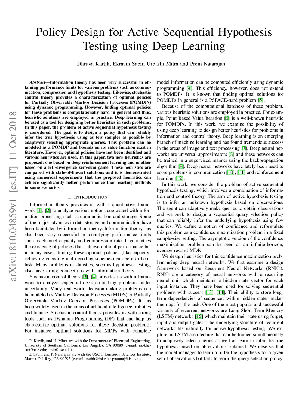 Information theory has been very successful in obtaining performance limits for various problems such as communication, compression and hypothesis testing. Likewise, stochastic control theory provides a characterization of optimal policies for Partially Observable Markov Decision Processes (POMDPs) using dynamic programming. However, finding optimal policies for these problems is computationally hard in general and thus, heuristic solutions are employed in practice. Deep learning can be used as a tool for designing better heuristics in such problems. In this paper, the problem of active sequential hypothesis testing is considered. The goal is to design a policy that can reliably infer the true hypothesis using as few samples as possible by adaptively selecting appropriate queries. This problem can be modeled as a POMDP and bounds on its value function exist in literature. However, optimal policies have not been identified and various heuristics are used. In this paper, two new heuristics are proposed: one based on deep reinforcement learning and another based on a KL-divergence zero-sum game. These heuristics are compared with state-of-the-art solutions and it is demonstrated using numerical experiments that the proposed heuristics can achieve significantly better performance than existing methods in some scenarios.