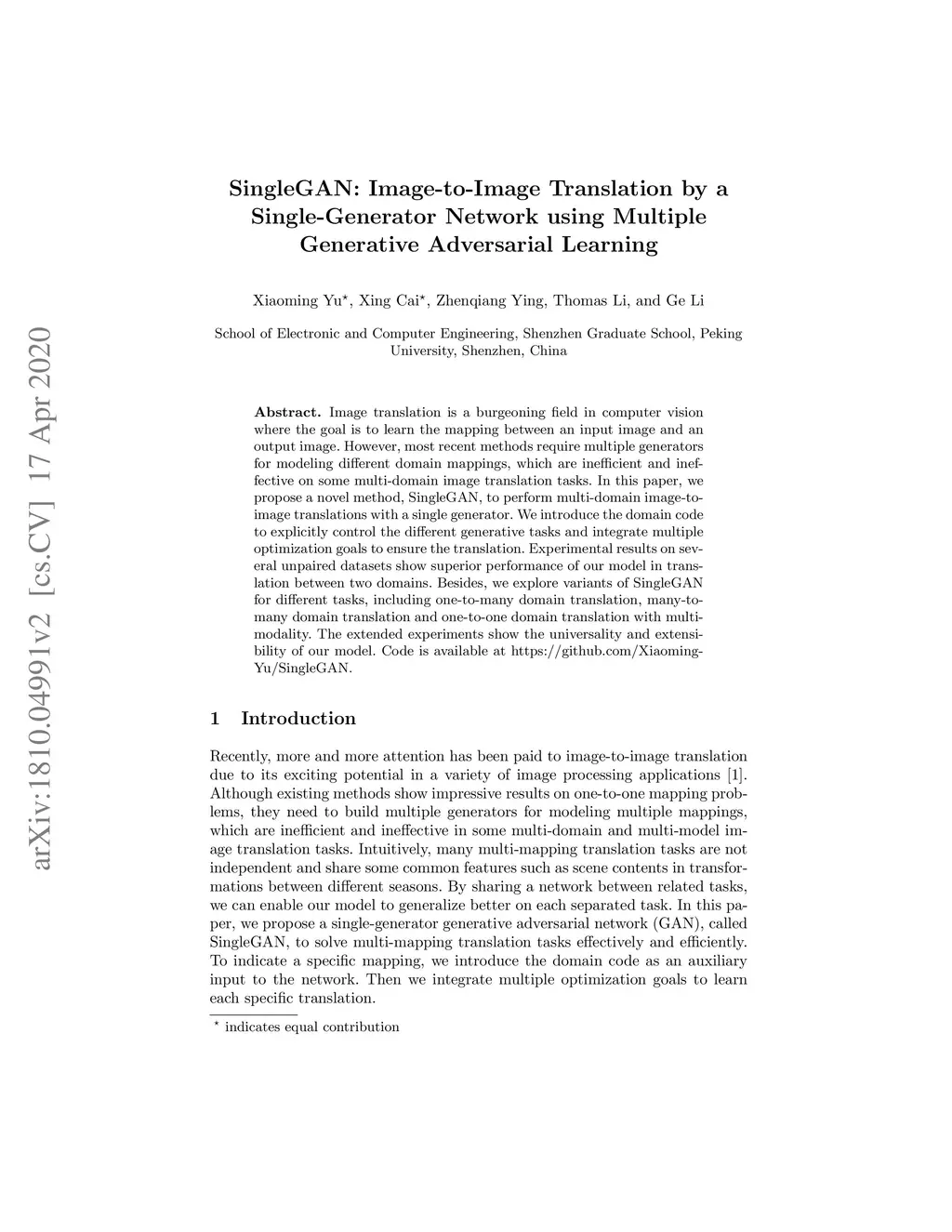 SingleGAN: Image-to-Image Translation by a Single-Generator Network