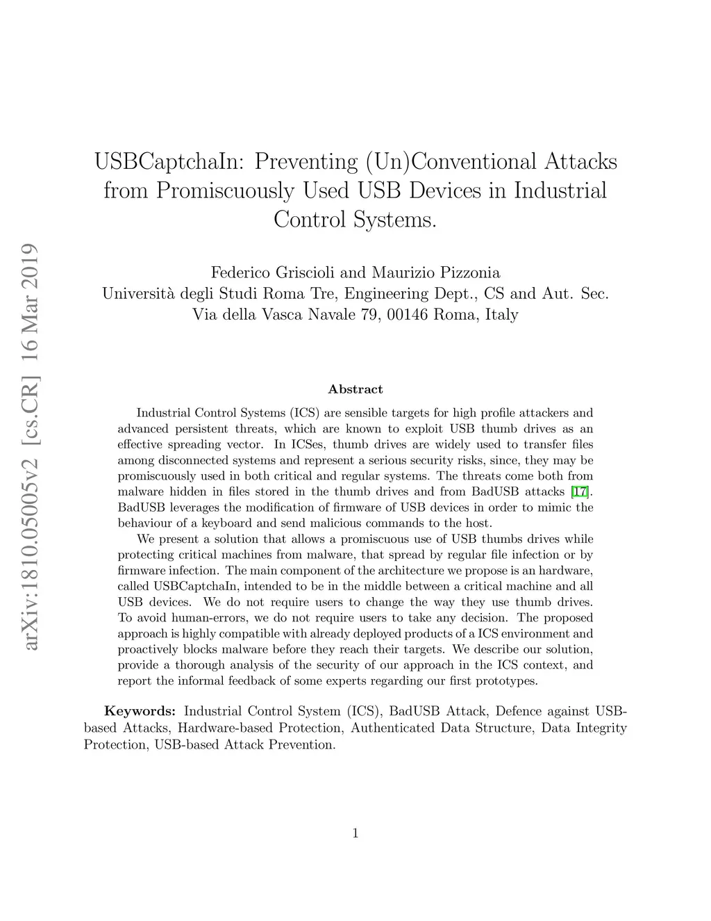 Industrial Control Systems (ICS) are sensible targets for high profile attackers and advanced persistent threats, which are known to exploit USB thumb drives as an effective spreading vector. In ICSes, thumb drives are widely used to transfer files among disconnected systems and represent a serious security risks, since, they may be promiscuously used in both critical and regular systems. The threats come both from malware hidden in files stored in the thumb drives and from BadUSB attacks [16]. BadUSB leverages the modification of firmware of USB devices in order to mimic the behaviour of a keyboard and send malicious commands to the host. We present a solution that allows a promiscuous use of USB thumbs drives while protecting critical machines from malware, that spread by regular file infection or by firmware infection. The main component of the architecture we propose is an hardware, called USBCaptchaIn, intended to be in the middle between a critical machine and all USB devices. We do not require users to change the way they use thumb drives. To avoid human-errors, we do not require users to take any decision. The proposed approach is highly compatible with already deployed products of a ICS environment and proactively blocks malware before they reach their targets. We describe our solution, provide a thorough analysis of the security of our approach in the ICS context, and report the informal feedback of some experts regarding our first prototypes.