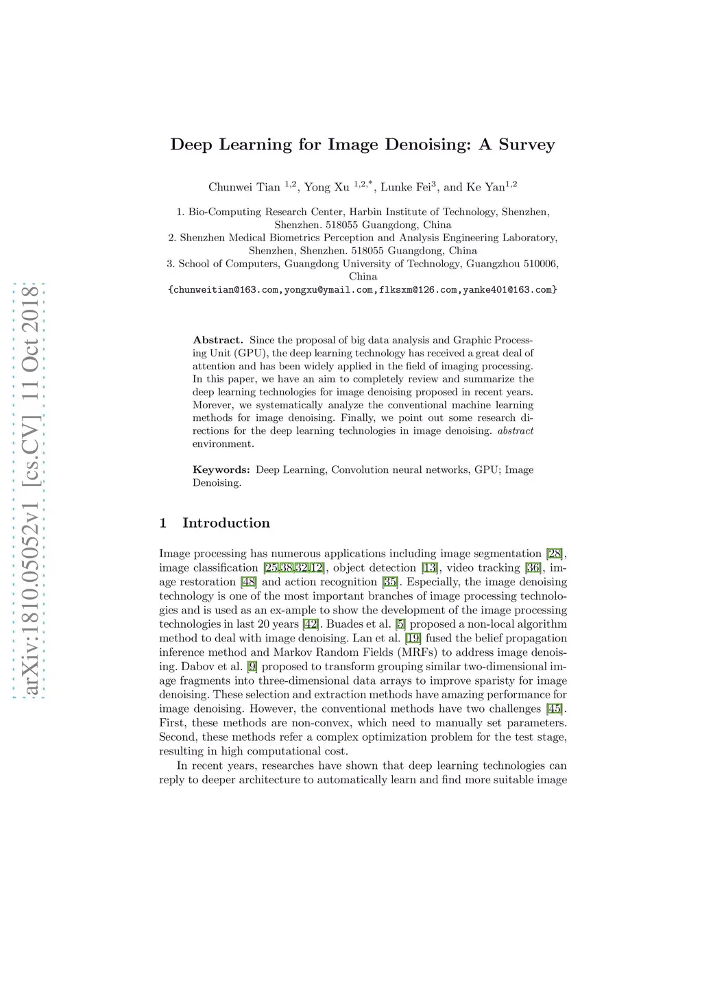 Since the proposal of big data analysis and Graphic Processing Unit (GPU), the deep learning technology has received a great deal of attention and has been widely applied in the field of imaging processing. In this paper, we have an aim to completely review and summarize the deep learning technologies for image denoising proposed in recent years. Morever, we systematically analyze the conventional machine learning methods for image denoising. Finally, we point out some research directions for the deep learning technologies in image denoising.