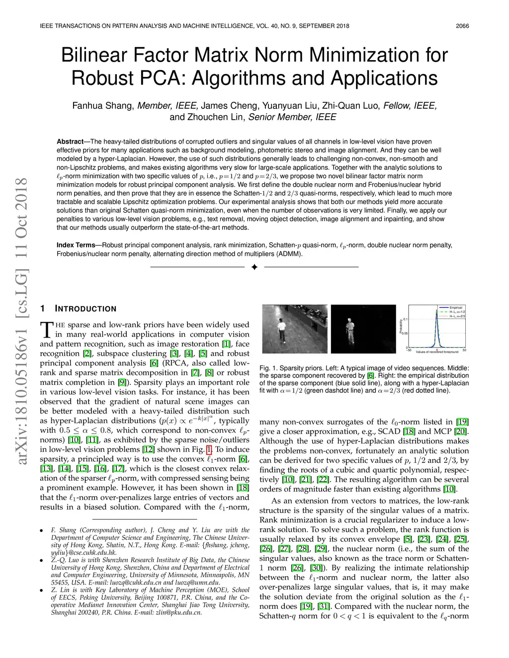The heavy-tailed distributions of corrupted outliers and singular values of all channels in low-level vision have proven effective priors for many applications such as background modeling, photometric stereo and image alignment. And they can be well modeled by a hyper-Laplacian. However, the use of such distributions generally leads to challenging non-convex, non-smooth and non-Lipschitz problems, and makes existing algorithms very slow for large-scale applications. Together with the analytic solutions to lp-norm minimization with two specific values of p, i.e., p=1/2 and p=2/3, we propose two novel bilinear factor matrix norm minimization models for robust principal component analysis. We first define the double nuclear norm and Frobenius/nuclear hybrid norm penalties, and then prove that they are in essence the Schatten-1/2 and 2/3 quasi-norms, respectively, which lead to much more tractable and scalable Lipschitz optimization problems. Our experimental analysis shows that both our methods yield more accurate solutions than original Schatten quasi-norm minimization, even when the number of observations is very limited. Finally, we apply our penalties to various low-level vision problems, e.g., text removal, moving object detection, image alignment and inpainting, and show that our methods usually outperform the state-of-the-art methods.