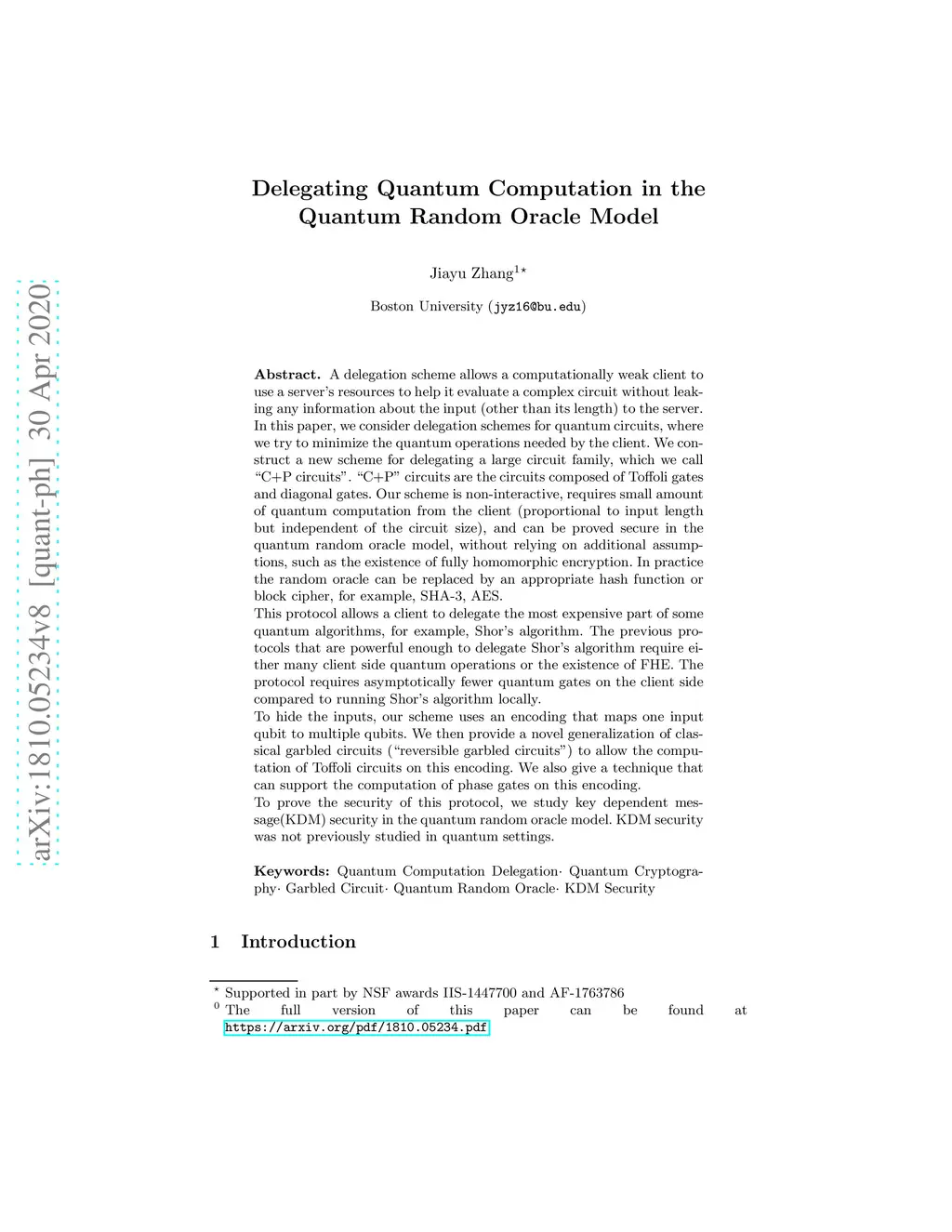 In this paper, we construct a new scheme for delegating a large circuit family, which we call "C+P circuits". "C+P" circuits are the circuits composed of Toffoli gates and diagonal gates. Our scheme is non-interactive, only requires small quantum resources on the client side, and can be proved secure in the quantum random oracle model, without relying on additional assumptions, for example, the existence of fully homomorphic encryption. In practice the random oracle can be replaced by appropriate hash functions or symmetric key encryption schemes, for example, SHA-3, AES. This protocol allows a client to delegate the most expensive part of some quantum algorithms, for example, Shor's algorithm. The previous protocols that are powerful enough to delegate Shor's algorithm require either many rounds of interactions or the existence of FHE. The quantum resources required by the client are fewer than when it runs Shor's algorithm locally. Different from many previous protocols, our scheme is not based on quantum one time pad, but on a new encoding called "entanglement encoding". We then generalize the garbled circuit to reversible garbled circuit to allow the computation on this encoding. To prove the security of this protocol, we study key dependent message(KDM) security in the quantum random oracle model. Then as a natural generalization, we define and study quantum KDM security. KDM security was not previously studied in quantum settings.