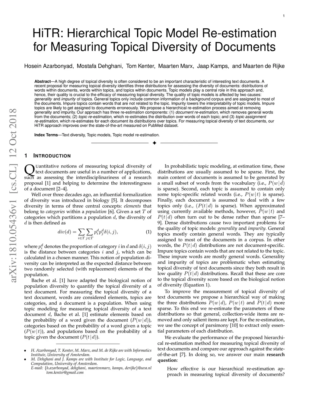 A high degree of topical diversity is often considered to be an important characteristic of interesting text documents. A recent proposal for measuring topical diversity identifies three distributions for assessing the diversity of documents: distributions of words within documents, words within topics, and topics within documents. Topic models play a central role in this approach and, hence, their quality is crucial to the efficacy of measuring topical diversity. The quality of topic models is affected by two causes: generality and impurity of topics. General topics only include common information of a background corpus and are assigned to most of the documents. Impure topics contain words that are not related to the topic. Impurity lowers the interpretability of topic models. Impure topics are likely to get assigned to documents erroneously. We propose a hierarchical re-estimation process aimed at removing generality and impurity. Our approach has three re-estimation components: (1) document re-estimation, which removes general words from the documents; (2) topic re-estimation, which re-estimates the distribution over words of each topic; and (3) topic assignment re-estimation, which re-estimates for each document its distributions over topics. For measuring topical diversity of text documents, our HiTR approach improves over the state-of-the-art measured on PubMed dataset.