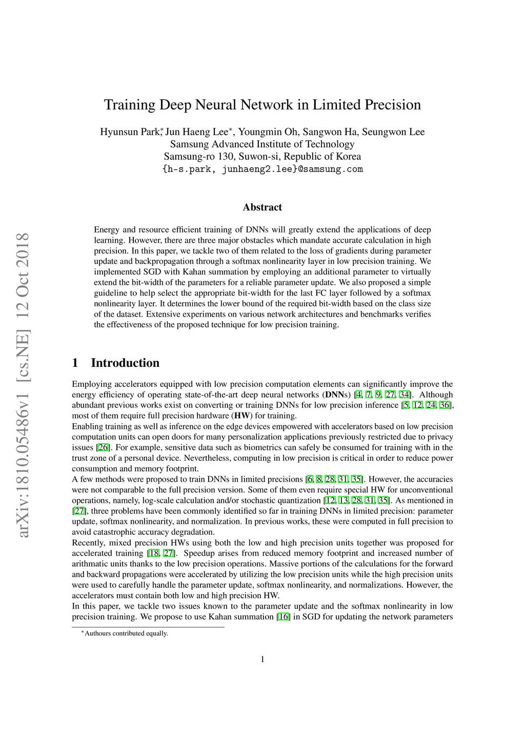 Energy and resource efficient training of DNNs will greatly extend the applications of deep learning. However, there are three major obstacles which mandate accurate calculation in high precision. In this paper, we tackle two of them related to the loss of gradients during parameter update and backpropagation through a softmax nonlinearity layer in low precision training. We implemented SGD with Kahan summation by employing an additional parameter to virtually extend the bit-width of the parameters for a reliable parameter update. We also proposed a simple guideline to help select the appropriate bit-width for the last FC layer followed by a softmax nonlinearity layer. It determines the lower bound of the required bit-width based on the class size of the dataset. Extensive experiments on various network architectures and benchmarks verifies the effectiveness of the proposed technique for low precision training.