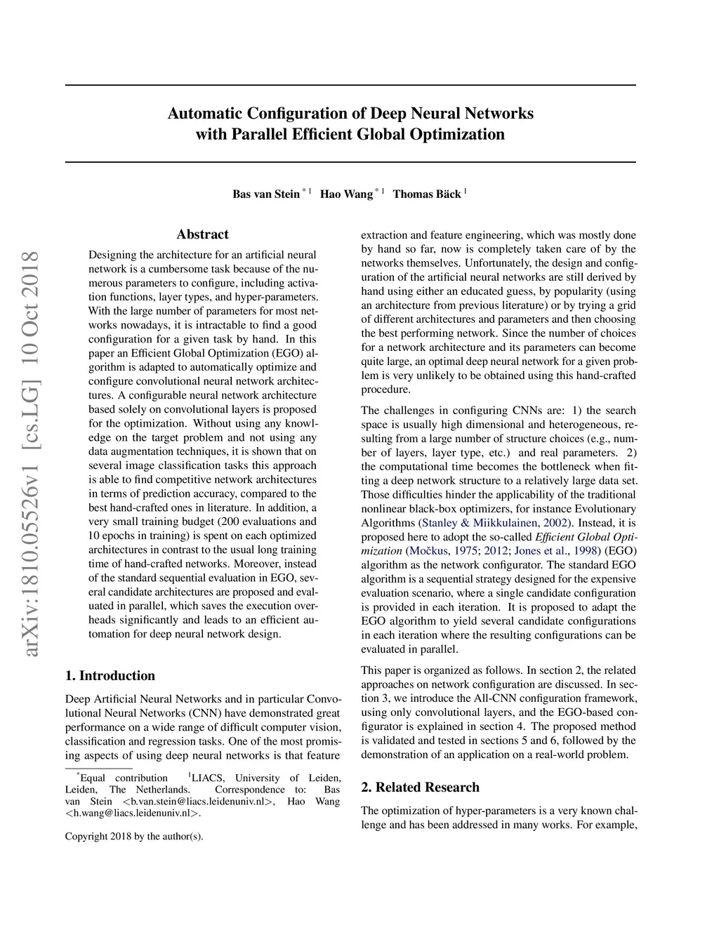 Designing the architecture for an artificial neural network is a cumbersome task because of the numerous parameters to configure, including activation functions, layer types, and hyper-parameters. With the large number of parameters for most networks nowadays, it is intractable to find a good configuration for a given task by hand. In this paper an Efficient Global Optimization (EGO) algorithm is adapted to automatically optimize and configure convolutional neural network architectures. A configurable neural network architecture based solely on convolutional layers is proposed for the optimization. Without using any knowledge on the target problem and not using any data augmentation techniques, it is shown that on several image classification tasks this approach is able to find competitive network architectures in terms of prediction accuracy, compared to the best hand-crafted ones in literature. In addition, a very small training budget (200 evaluations and 10 epochs in training) is spent on each optimized architectures in contrast to the usual long training time of hand-crafted networks. Moreover, instead of the standard sequential evaluation in EGO, several candidate architectures are proposed and evaluated in parallel, which saves the execution overheads significantly and leads to an efficient automation for deep neural network design.