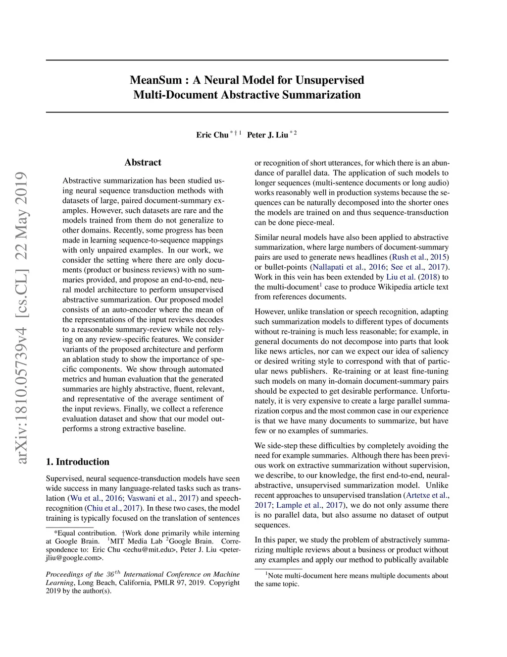 MeanSum: A Neural Model for Unsupervised Multi-document Abstractive