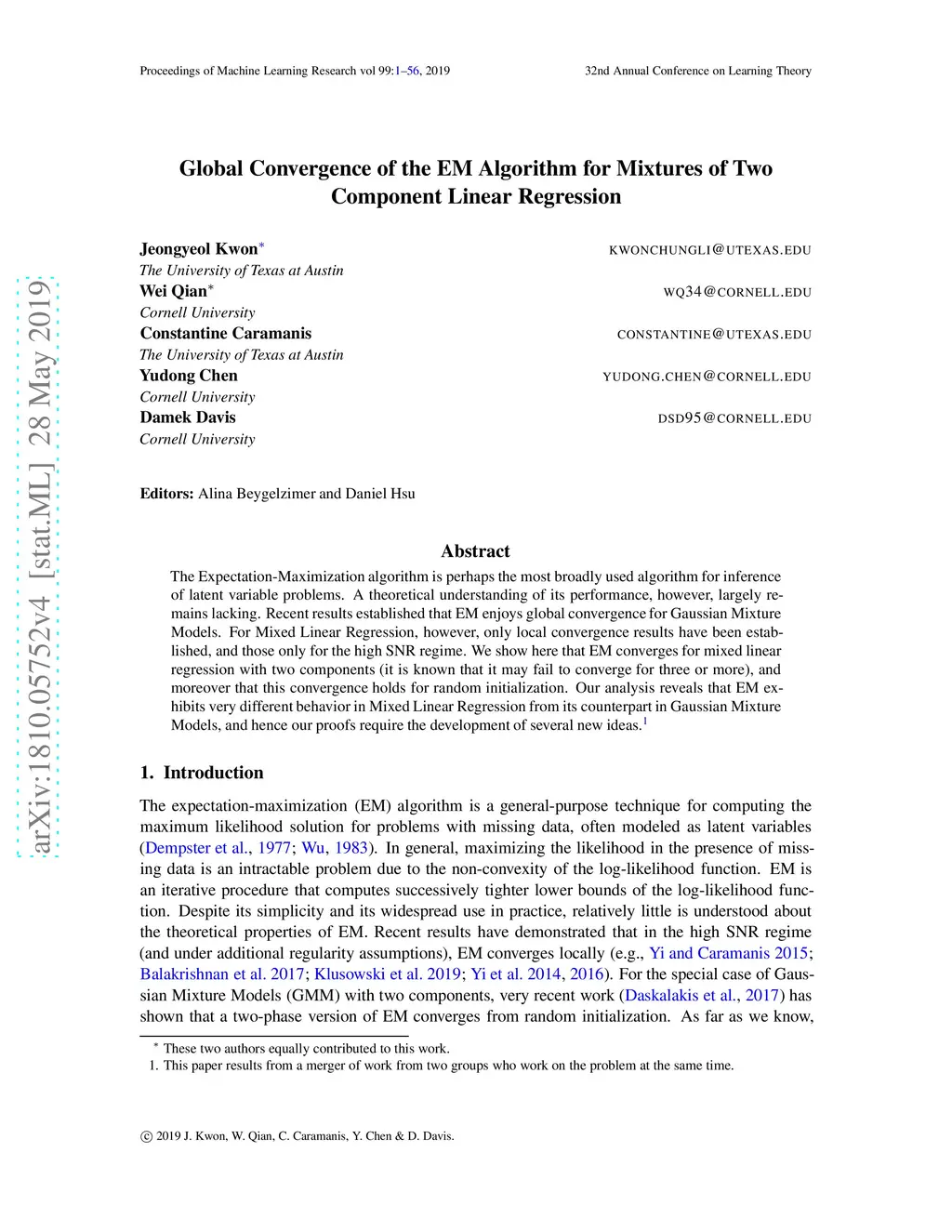The Expectation-Maximization algorithm is perhaps the most broadly used algorithm for inference of latent variable problems. A theoretical understanding of its performance, however, largely remains lacking. Recent results established that EM enjoys global convergence for Gaussian Mixture Models. For Mixed Linear Regression, however, only local convergence results have been established, and those only for the high SNR regime. We show here that EM converges for mixed linear regression with two components (it is known that it may fail to converge for three or more), and moreover that this convergence holds for random initialization. Our analysis reveals that EM exhibits very different behavior in Mixed Linear Regression from its behavior in Gaussian Mixture Models, and hence our proofs require the development of several new ideas.