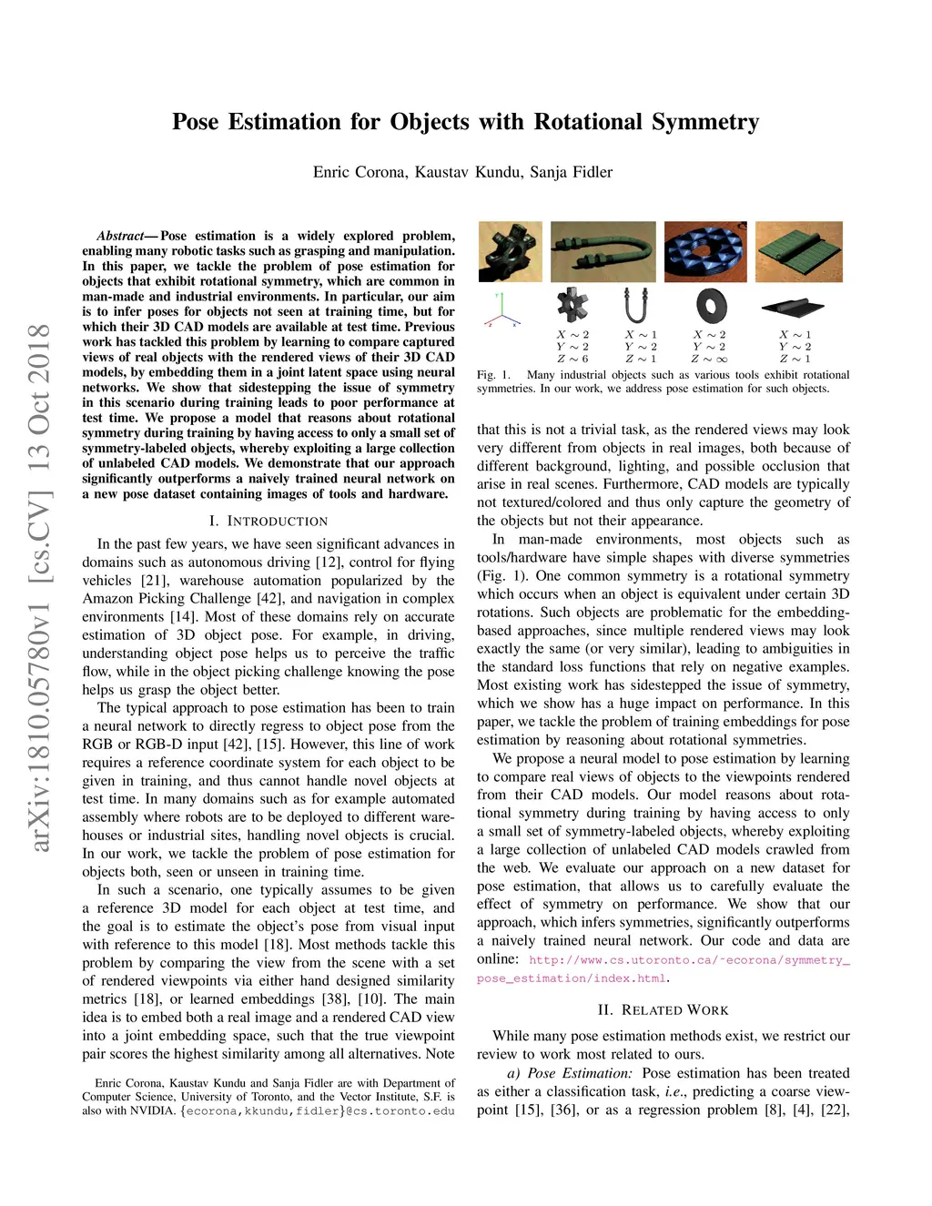 Pose estimation is a widely explored problem, enabling many robotic tasks such as grasping and manipulation. In this paper, we tackle the problem of pose estimation for objects that exhibit rotational symmetry, which are common in man-made and industrial environments. In particular, our aim is to infer poses for objects not seen at training time, but for which their 3D CAD models are available at test time. Previous work has tackled this problem by learning to compare captured views of real objects with the rendered views of their 3D CAD models, by embedding them in a joint latent space using neural networks. We show that sidestepping the issue of symmetry in this scenario during training leads to poor performance at test time. We propose a model that reasons about rotational symmetry during training by having access to only a small set of symmetry-labeled objects, whereby exploiting a large collection of unlabeled CAD models. We demonstrate that our approach significantly outperforms a naively trained neural network on a new pose dataset containing images of tools and hardware.