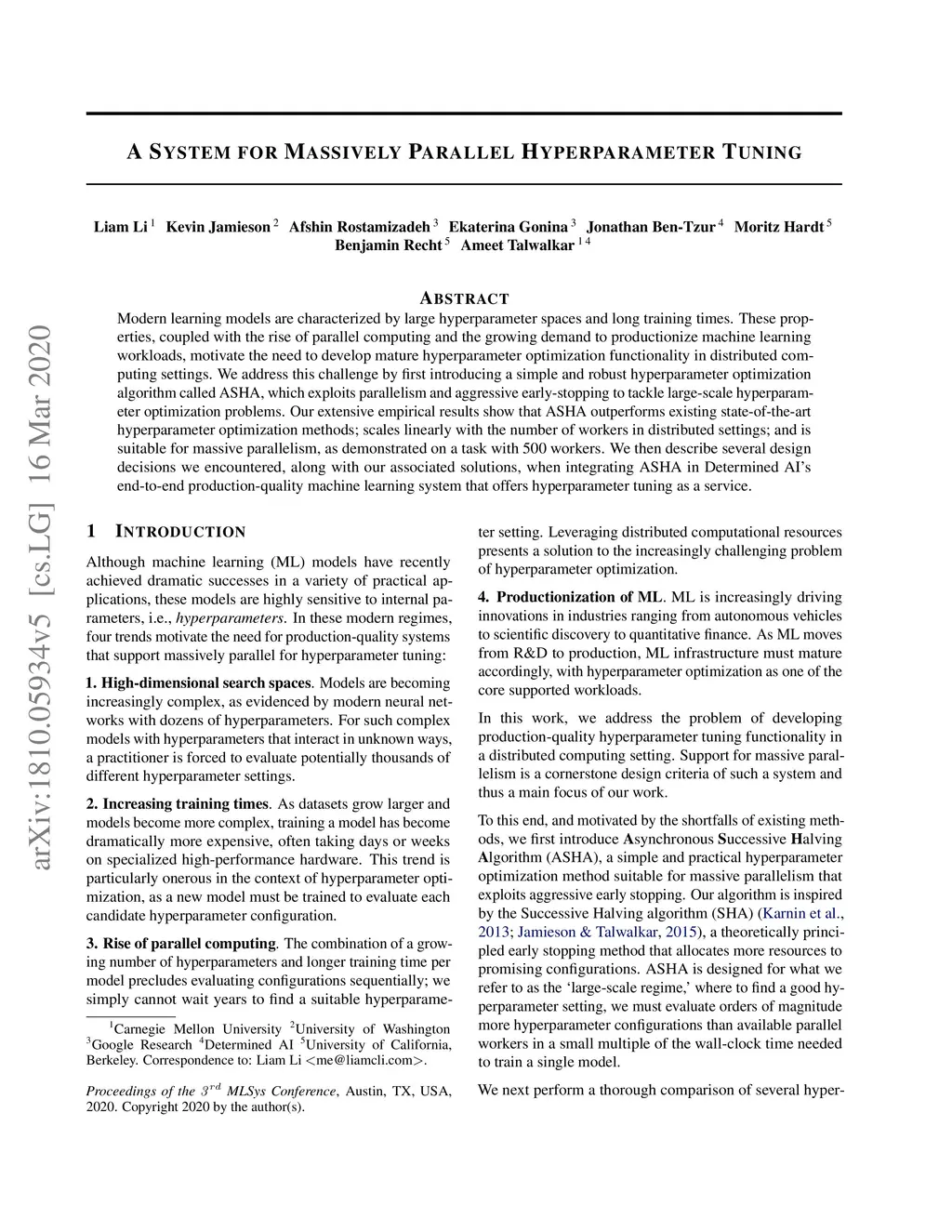 Modern learning models are characterized by large hyperparameter spaces and long training times. These properties, coupled with the rise of parallel computing and the growing demand to productionize machine learning workloads, motivate the need to develop mature hyperparameter optimization functionality in distributed computing settings. We address this challenge by first introducing a simple and robust hyperparameter optimization algorithm called ASHA, which exploits parallelism and aggressive early-stopping to tackle large-scale hyperparameter optimization problems. Our extensive empirical results show that ASHA outperforms existing state-of-the-art hyperparameter optimization methods; scales linearly with the number of workers in distributed settings; and is suitable for massive parallelism, as demonstrated on a task with 500 workers. We then describe several design decisions we encountered, along with our associated solutions, when integrating ASHA in Determined AI's end-to-end production-quality machine learning system that offers hyperparameter tuning as a service.