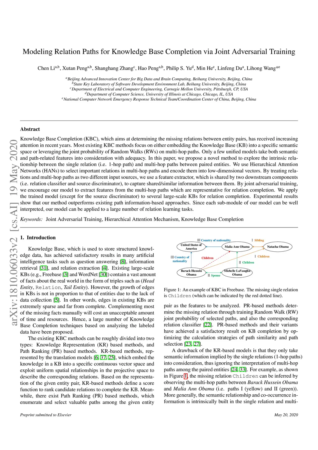 Knowledge Base Completion (KBC), which aims at determining the missing relations between entity pairs, has received increasing attention in recent years. Most existing KBC methods focus on either embedding the Knowledge Base (KB) into a specific semantic space or leveraging the joint probability of Random Walks (RWs) on multi-hop paths. Only a few unified models take both semantic and path-related features into consideration with adequacy. In this paper, we propose a novel method to explore the intrinsic relationship between the single relation (i.e. 1-hop path) and multi-hop paths between paired entities. We use Hierarchical Attention Networks (HANs) to select important relations in multi-hop paths and encode them into low-dimensional vectors. By treating relations and multi-hop paths as two different input sources, we use a feature extractor, which is shared by two downstream components (i.e. relation classifier and source discriminator), to capture shared/similar information between them. By joint adversarial training, we encourage our model to extract features from the multi-hop paths which are representative for relation completion. We apply the trained model (except for the source discriminator) to several large-scale KBs for relation completion. Experimental results show that our method outperforms existing path information-based approaches. Since each sub-module of our model can be well interpreted, our model can be applied to a large number of relation learning tasks.