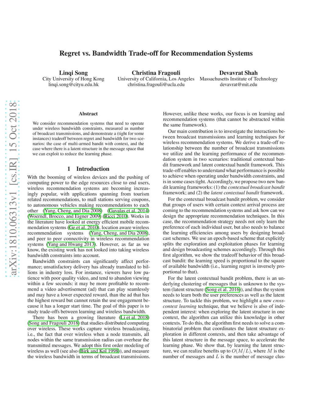 We consider recommendation systems that need to operate under wireless bandwidth constraints, measured as number of broadcast transmissions, and demonstrate a (tight for some instances) tradeoff between regret and bandwidth for two scenarios: the case of multi-armed bandit with context, and the case where there is a latent structure in the message space that we can exploit to reduce the learning phase.
