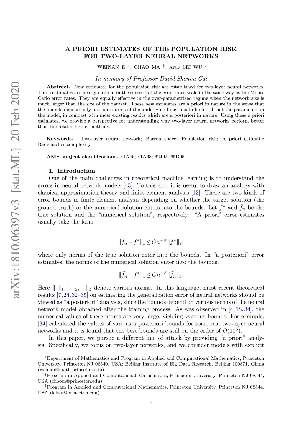 New estimates for the population risk are established for two-layer neural networks. These estimates are nearly optimal in the sense that the error rates scale in the same way as the Monte Carlo error rates. They are equally effective in the over-parametrized regime when the network size is much larger than the size of the dataset. These new estimates are a priori in nature in the sense that the bounds depend only on some norms of the underlying functions to be fitted, not the parameters in the model, in contrast with most existing results which are a posteriori in nature. Using these a priori estimates, we provide a perspective for understanding why two-layer neural networks perform better than the related kernel methods.