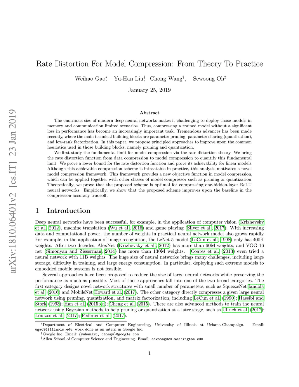The enormous size of modern deep neural networks makes it challenging to deploy those models in memory and communication limited scenarios. Thus, compressing a trained model without a significant loss in performance has become an increasingly important task. Tremendous advances has been made recently, where the main technical building blocks are parameter pruning, parameter sharing (quantization), and low-rank factorization. In this paper, we propose principled approaches to improve upon the common heuristics used in those building blocks, namely pruning and quantization. We first study the fundamental limit for model compression via the rate distortion theory. We bring the rate distortion function from data compression to model compression to quantify this fundamental limit. We prove a lower bound for the rate distortion function and prove its achievability for linear models. Although this achievable compression scheme is intractable in practice, this analysis motivates a novel model compression framework. This framework provides a new objective function in model compression, which can be applied together with other classes of model compressor such as pruning or quantization. Theoretically, we prove that the proposed scheme is optimal for compressing one-hidden-layer ReLU neural networks. Empirically, we show that the proposed scheme improves upon the baseline in the compression-accuracy tradeoff.
