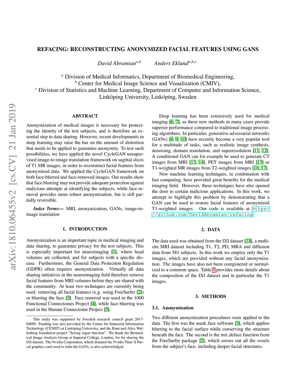 Anonymization of medical images is necessary for protecting the identity of the test subjects, and is therefore an essential step in data sharing. However, recent developments in deep learning may raise the bar on the amount of distortion that needs to be applied to guarantee anonymity. To test such possibilities, we have applied the novel CycleGAN unsupervised image-to-image translation framework on sagittal slices of T1 MR images, in order to reconstruct facial features from anonymized data. We applied the CycleGAN framework on both face-blurred and face-removed images. Our results show that face blurring may not provide adequate protection against malicious attempts at identifying the subjects, while face removal provides more robust anonymization, but is still partially reversible.
