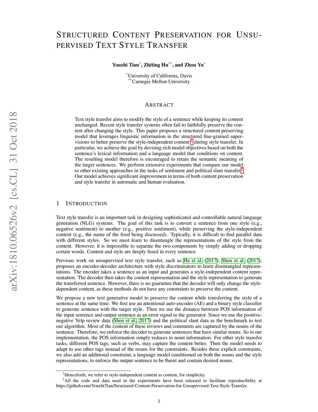 Structured Content Preservation for Unsupervised Text Style Transfer