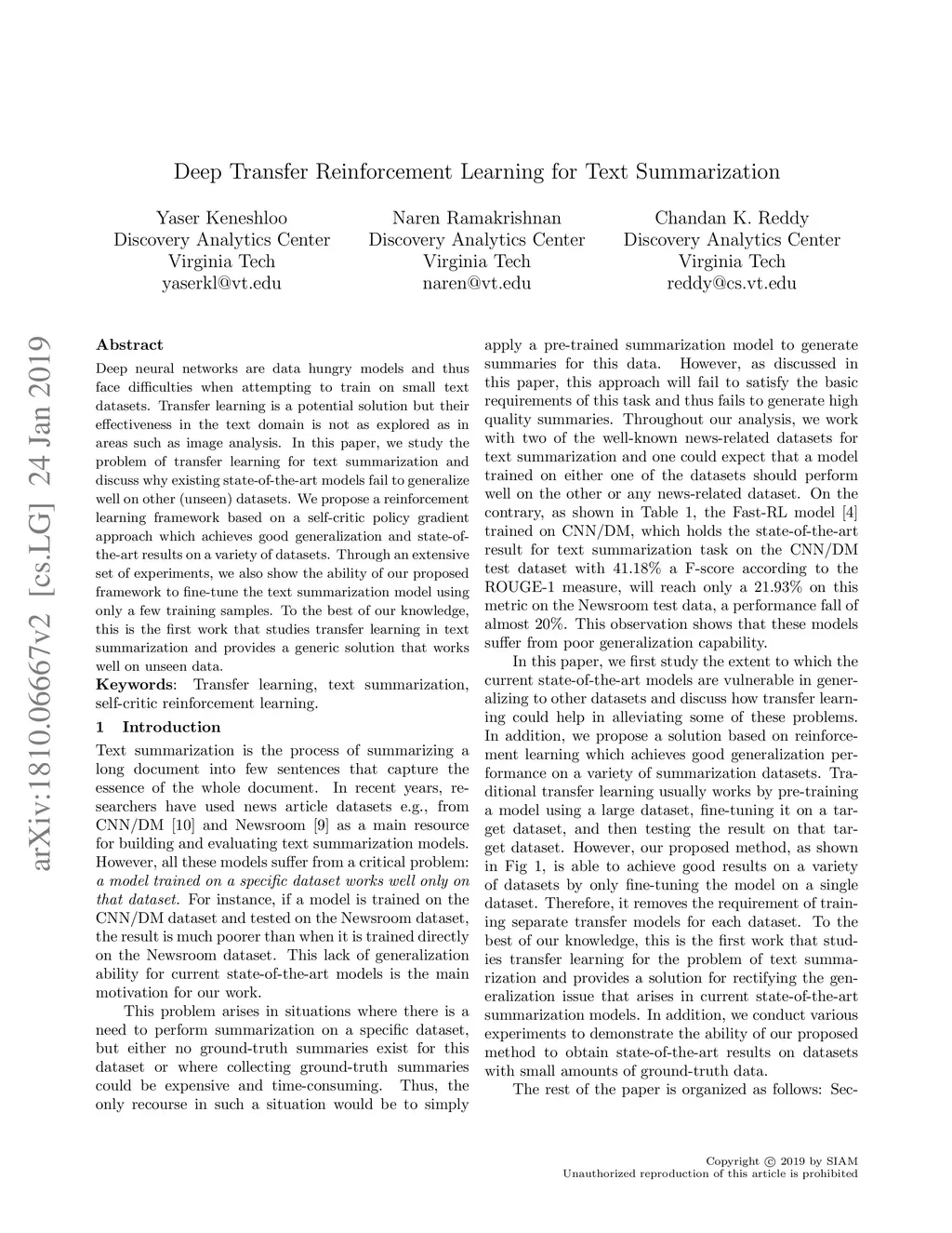 Deep neural networks are data hungry models and thus face difficulties when attempting to train on small text datasets. Transfer learning is a potential solution but their effectiveness in the text domain is not as explored as in areas such as image analysis. In this paper, we study the problem of transfer learning for text summarization and discuss why existing state-of-the-art models fail to generalize well on other (unseen) datasets. We propose a reinforcement learning framework based on a self-critic policy gradient approach which achieves good generalization and state-of-the-art results on a variety of datasets. Through an extensive set of experiments, we also show the ability of our proposed framework to fine-tune the text summarization model using only a few training samples. To the best of our knowledge, this is the first work that studies transfer learning in text summarization and provides a generic solution that works well on unseen data.