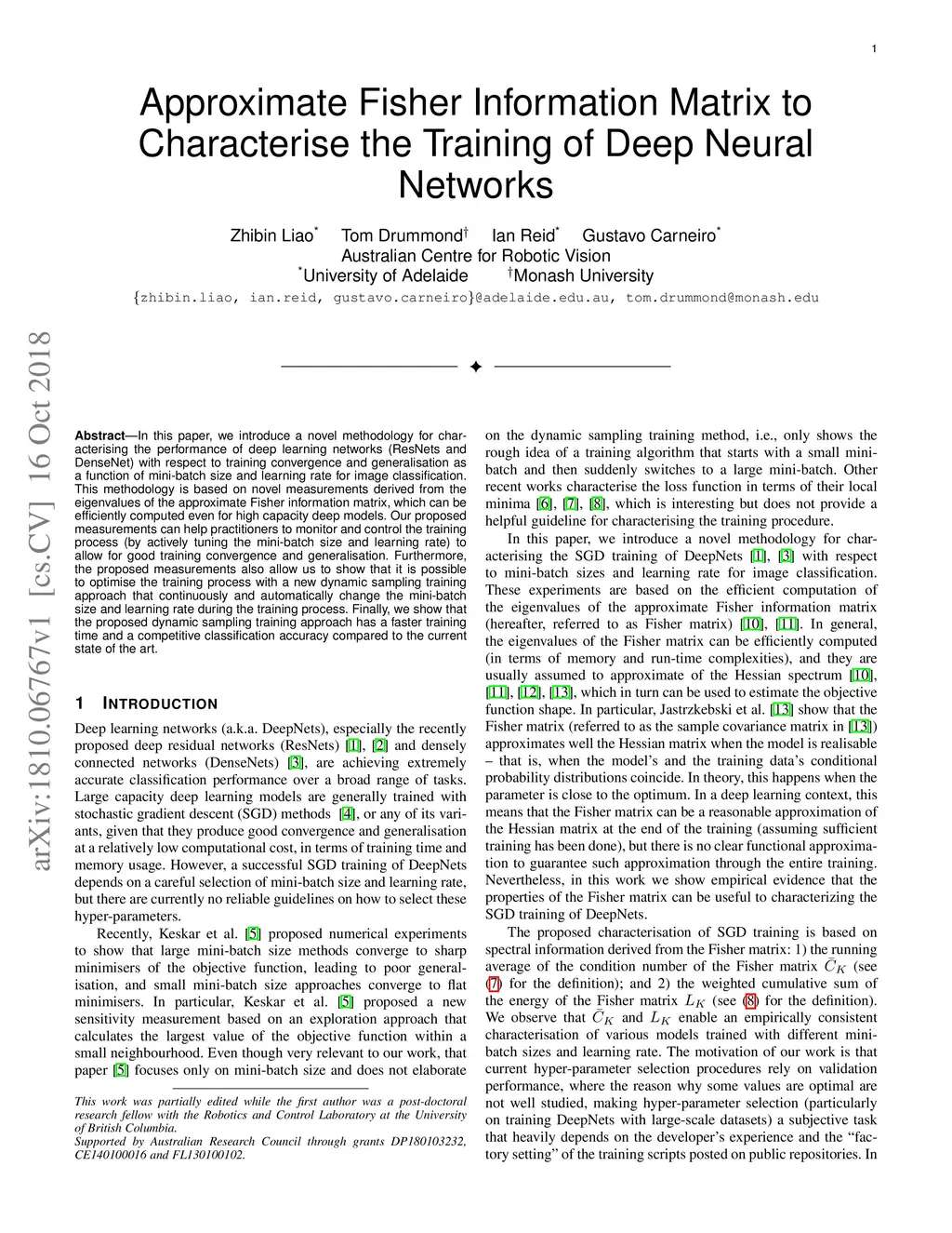In this paper, we introduce a novel methodology for characterising the performance of deep learning networks (ResNets and DenseNet) with respect to training convergence and generalisation as a function of mini-batch size and learning rate for image classification. This methodology is based on novel measurements derived from the eigenvalues of the approximate Fisher information matrix, which can be efficiently computed even for high capacity deep models. Our proposed measurements can help practitioners to monitor and control the training process (by actively tuning the mini-batch size and learning rate) to allow for good training convergence and generalisation. Furthermore, the proposed measurements also allow us to show that it is possible to optimise the training process with a new dynamic sampling training approach that continuously and automatically change the mini-batch size and learning rate during the training process. Finally, we show that the proposed dynamic sampling training approach has a faster training time and a competitive classification accuracy compared to the current state of the art.
