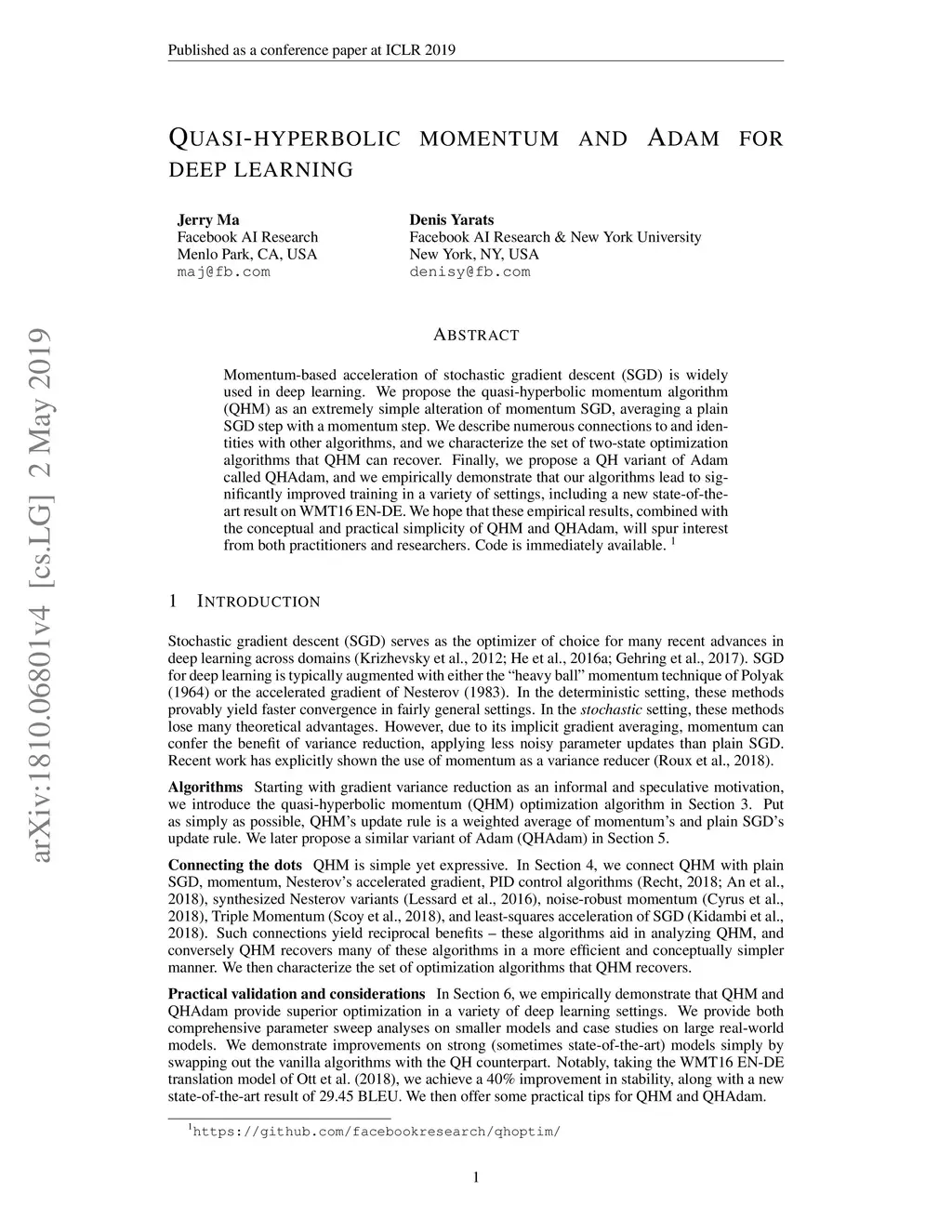 Momentum-based acceleration of stochastic gradient descent (SGD) is widely used in deep learning. We propose the quasi-hyperbolic momentum algorithm (QHM) as an extremely simple alteration of momentum SGD, averaging a plain SGD step with a momentum step. We describe numerous connections to and identities with other algorithms, and we characterize the set of two-state optimization algorithms that QHM can recover. Finally, we propose a QH variant of Adam called QHAdam, and we empirically demonstrate that our algorithms lead to significantly improved training in a variety of settings, including a new state-of-the-art result on WMT16 EN-DE. We hope that these empirical results, combined with the conceptual and practical simplicity of QHM and QHAdam, will spur interest from both practitioners and researchers. Code is immediately available.
