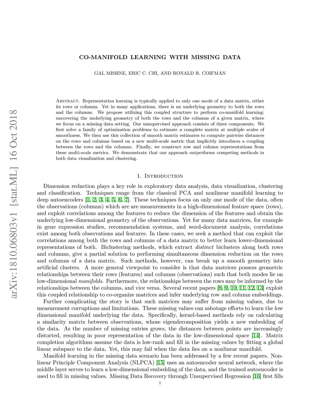 Representation learning is typically applied to only one mode of a data matrix, either its rows or columns. Yet in many applications, there is an underlying geometry to both the rows and the columns. We propose utilizing this coupled structure to perform co-manifold learning: uncovering the underlying geometry of both the rows and the columns of a given matrix, where we focus on a missing data setting. Our unsupervised approach consists of three components. We first solve a family of optimization problems to estimate a complete matrix at multiple scales of smoothness. We then use this collection of smooth matrix estimates to compute pairwise distances on the rows and columns based on a new multi-scale metric that implicitly introduces a coupling between the rows and the columns. Finally, we construct row and column representations from these multi-scale metrics. We demonstrate that our approach outperforms competing methods in both data visualization and clustering.