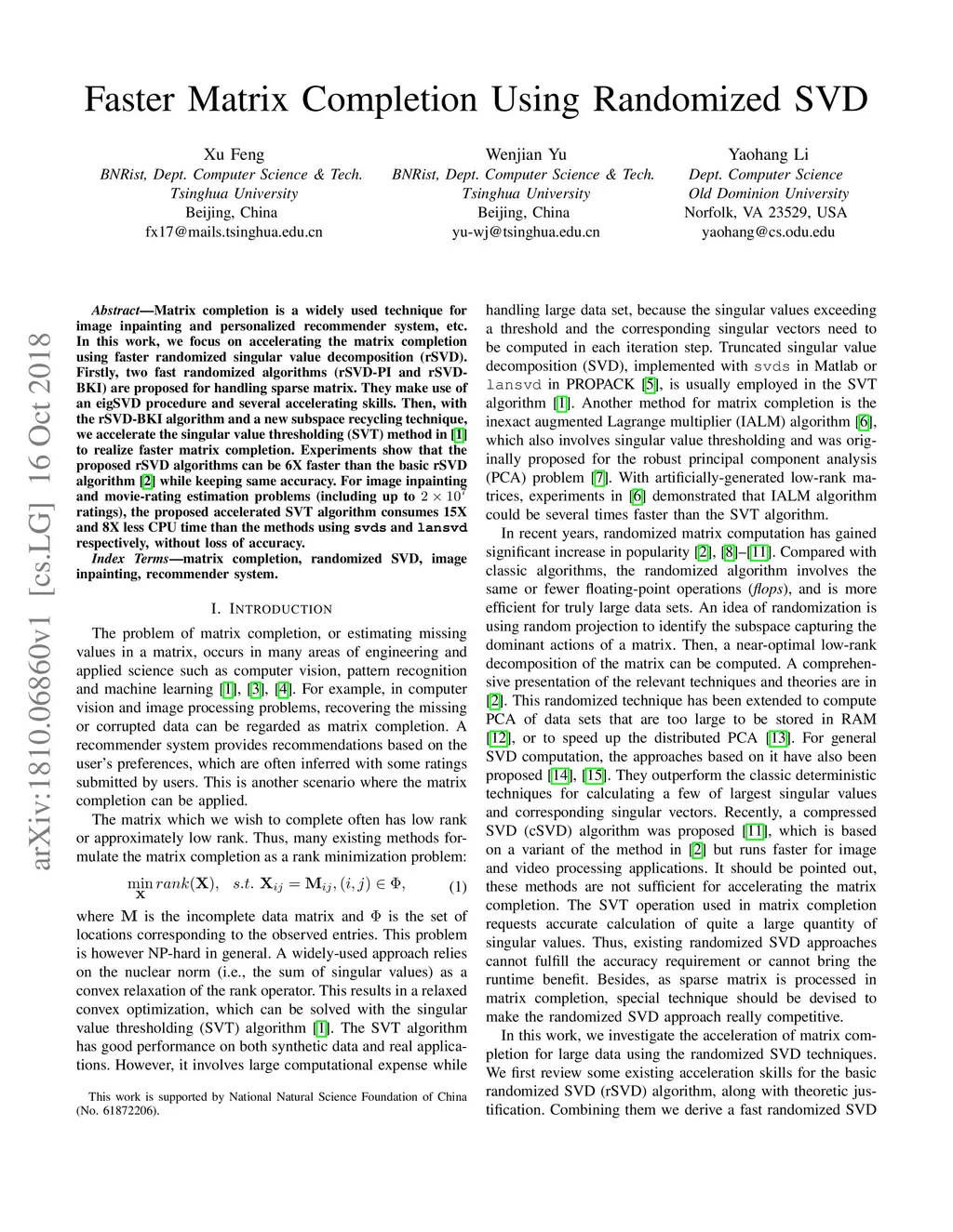 Matrix completion is a widely used technique for image inpainting and personalized recommender system, etc. In this work, we focus on accelerating the matrix completion using faster randomized singular value decomposition (rSVD). Firstly, two fast randomized algorithms (rSVD-PI and rSVD- BKI) are proposed for handling sparse matrix. They make use of an eigSVD procedure and several accelerating skills. Then, with the rSVD-BKI algorithm and a new subspace recycling technique, we accelerate the singular value thresholding (SVT) method in [1] to realize faster matrix completion. Experiments show that the proposed rSVD algorithms can be 6X faster than the basic rSVD algorithm [2] while keeping same accuracy. For image inpainting and movie-rating estimation problems, the proposed accelerated SVT algorithm consumes 15X and 8X less CPU time than the methods using svds and lansvd respectively, without loss of accuracy.
