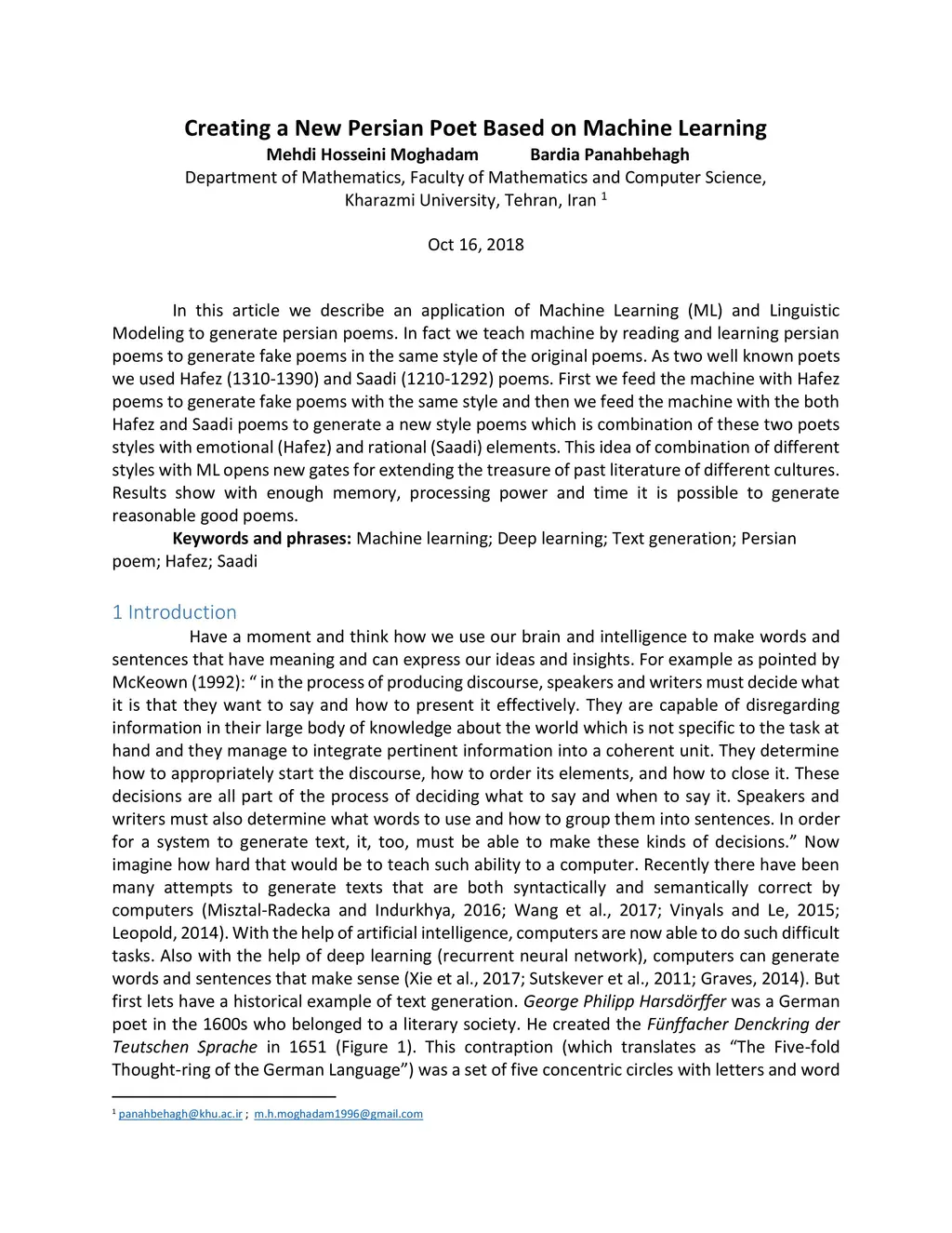 In this article we describe an application of Machine Learning (ML) and Linguistic Modeling to generate persian poems. In fact we teach machine by reading and learning persian poems to generate fake poems in the same style of the original poems. As two well known poets we used Hafez (1310-1390) and Saadi (1210-1292) poems. First we feed the machine with Hafez poems to generate fake poems with the same style and then we feed the machine with the both Hafez and Saadi poems to generate a new style poems which is combination of these two poets styles with emotional (Hafez) and rational (Saadi) elements. This idea of combination of different styles with ML opens new gates for extending the treasure of past literature of different cultures. Results show with enough memory, processing power and time it is possible to generate reasonable good poems.