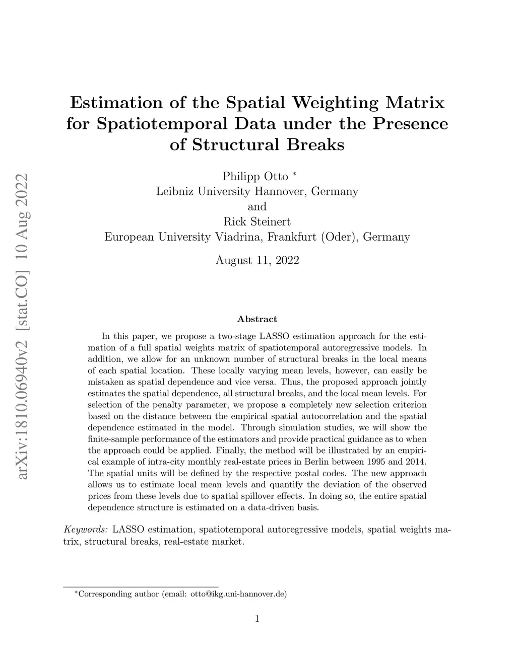 In this paper, we propose a two-step lasso estimation approach to estimate the full spatial weights matrix of spatiotemporal autoregressive models. In addition, we allow for an unknown number of structural breaks in the local means of each spatial locations. The proposed approach jointly estimates the spatial dependence, all structural breaks, and the local mean levels. In addition, it is easy to compute the suggested estimators, because of a convex objective function resulting from a slight simplification. Via simulation studies, we show the finite-sample performance of the estimators and provide a practical guidance, when the approach could be applied. Eventually, the invented method is illustrated by an empirical example of regional monthly real-estate prices in Berlin from 1995 to 2014. The spatial units are defined by the respective ZIP codes. In particular, we can estimate local mean levels and quantify the deviation of the observed prices from these levels due to spatial spill over effects.