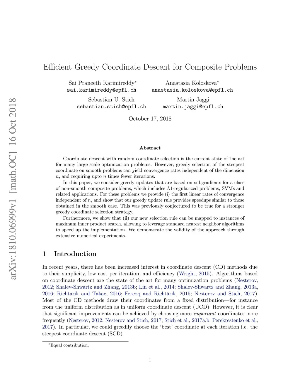 Coordinate descent with random coordinate selection is the current state of the art for many large scale optimization problems. However, greedy selection of the steepest coordinate on smooth problems can yield convergence rates independent of the dimension , and requiring upto times fewer iterations. In this paper, we consider greedy updates that are based on subgradients for a class of non-smooth composite problems, which includes -regularized problems, SVMs and related applications. For these problems we provide (i) the first linear rates of convergence independent of , and show that our greedy update rule provides speedups similar to those obtained in the smooth case. This was previously conjectured to be true for a stronger greedy coordinate selection strategy. Furthermore, we show that (ii) our new selection rule can be mapped to instances of maximum inner product search, allowing to leverage standard nearest neighbor algorithms to speed up the implementation. We demonstrate the validity of the approach through extensive numerical experiments.