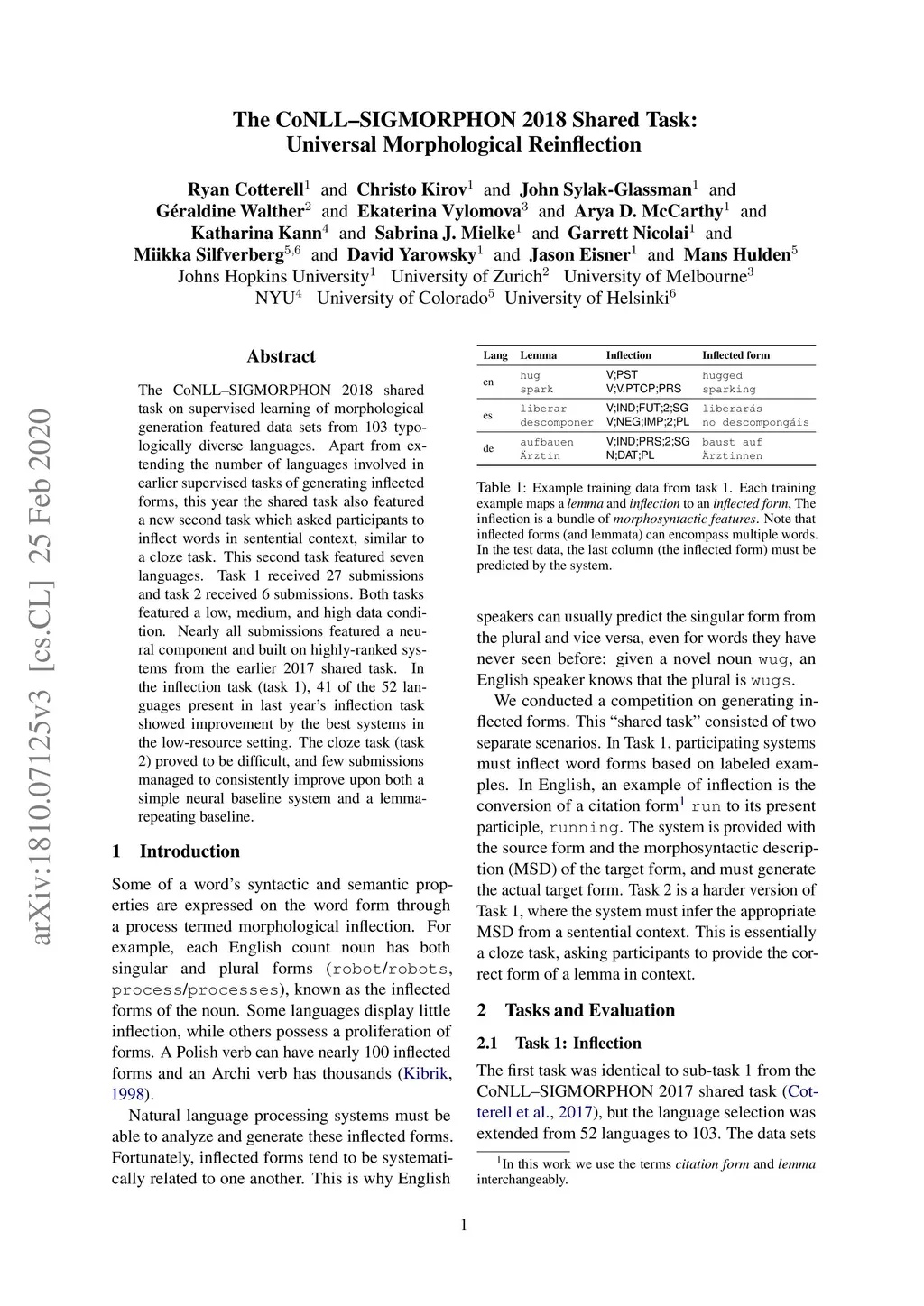The CoNLL--SIGMORPHON 2018 Shared Task: Universal Morphological