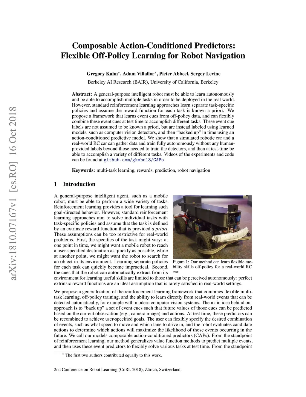 A general-purpose intelligent robot must be able to learn autonomously and be able to accomplish multiple tasks in order to be deployed in the real world. However, standard reinforcement learning approaches learn separate task-specific policies and assume the reward function for each task is known a priori. We propose a framework that learns event cues from off-policy data, and can flexibly combine these event cues at test time to accomplish different tasks. These event cue labels are not assumed to be known a priori, but are instead labeled using learned models, such as computer vision detectors, and then `backed up' in time using an action-conditioned predictive model. We show that a simulated robotic car and a real-world RC car can gather data and train fully autonomously without any human-provided labels beyond those needed to train the detectors, and then at test-time be able to accomplish a variety of different tasks. Videos of the experiments and code can be found at https://github.com/gkahn13/CAPs