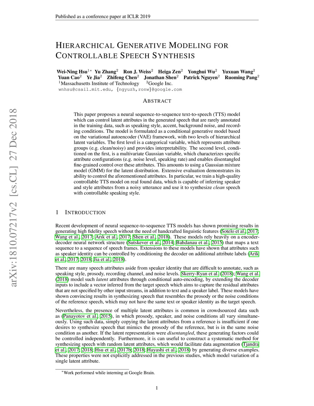 This paper proposes a neural sequence-to-sequence text-to-speech (TTS) model which can control latent attributes in the generated speech that are rarely annotated in the training data, such as speaking style, accent, background noise, and recording conditions. The model is formulated as a conditional generative model based on the variational autoencoder (VAE) framework, with two levels of hierarchical latent variables. The first level is a categorical variable, which represents attribute groups (e.g. clean/noisy) and provides interpretability. The second level, conditioned on the first, is a multivariate Gaussian variable, which characterizes specific attribute configurations (e.g. noise level, speaking rate) and enables disentangled fine-grained control over these attributes. This amounts to using a Gaussian mixture model (GMM) for the latent distribution. Extensive evaluation demonstrates its ability to control the aforementioned attributes. In particular, we train a high-quality controllable TTS model on real found data, which is capable of inferring speaker and style attributes from a noisy utterance and use it to synthesize clean speech with controllable speaking style.