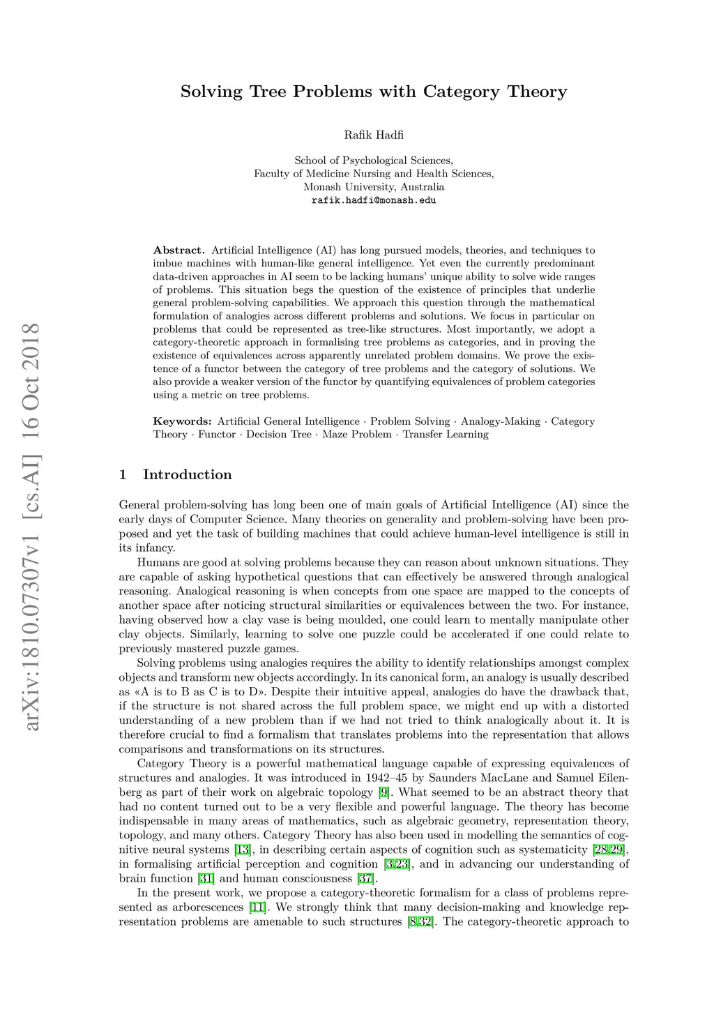 Artificial Intelligence (AI) has long pursued models, theories, and techniques to imbue machines with human-like general intelligence. Yet even the currently predominant data-driven approaches in AI seem to be lacking humans' unique ability to solve wide ranges of problems. This situation begs the question of the existence of principles that underlie general problem-solving capabilities. We approach this question through the mathematical formulation of analogies across different problems and solutions. We focus in particular on problems that could be represented as tree-like structures. Most importantly, we adopt a category-theoretic approach in formalising tree problems as categories, and in proving the existence of equivalences across apparently unrelated problem domains. We prove the existence of a functor between the category of tree problems and the category of solutions. We also provide a weaker version of the functor by quantifying equivalences of problem categories using a metric on tree problems.