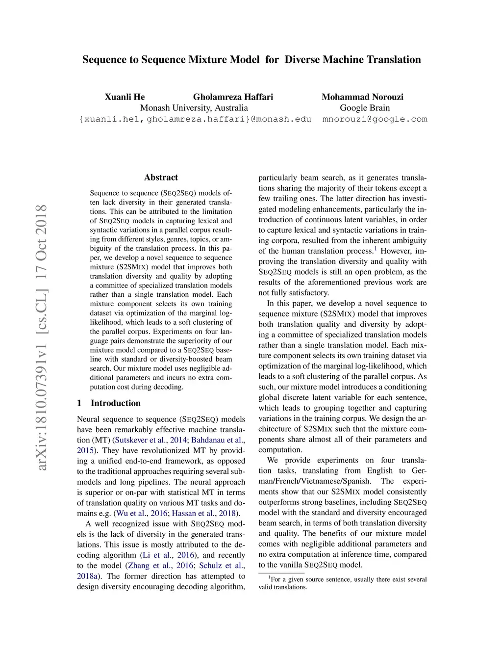 Sequence to Sequence Mixture Model for Diverse Machine Translation