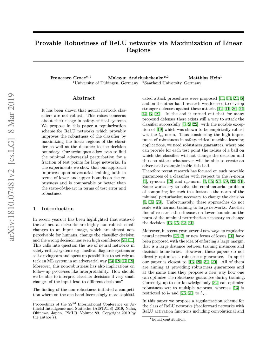 It has been shown that neural network classifiers are not robust. This raises concerns about their usage in safety-critical systems. We propose in this paper a regularization scheme for ReLU networks which provably improves the robustness of the classifier by maximizing the linear regions of the classifier as well as the distance to the decision boundary. Our techniques allow even to find the minimal adversarial perturbation for a fraction of test points for large networks. In the experiments we show that our approach improves upon adversarial training both in terms of lower and upper bounds on the robustness and is comparable or better than the state-of-the-art in terms of test error and robustness.