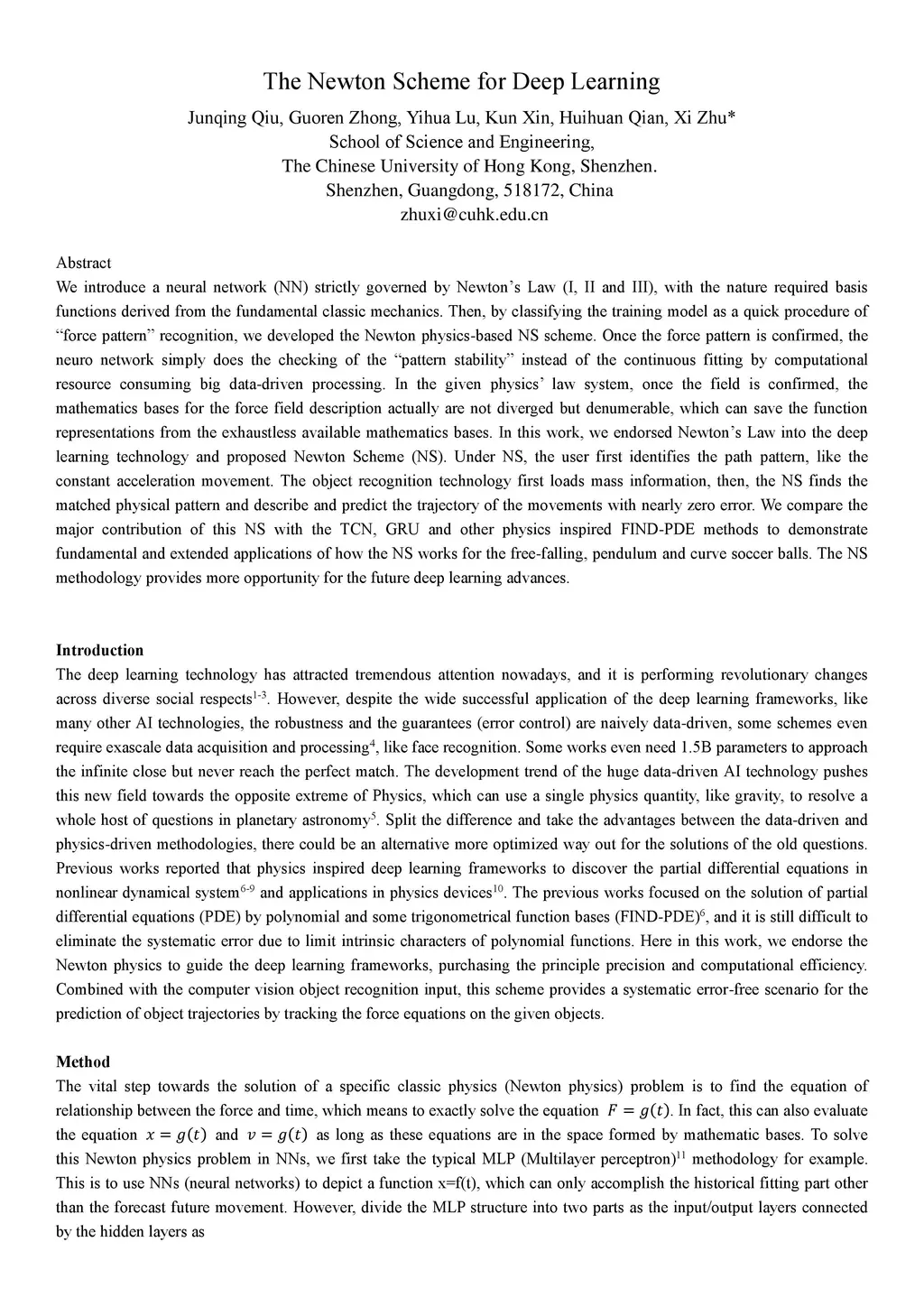 We introduce a neural network (NN) strictly governed by Newton's Law, with the nature required basis functions derived from the fundamental classic mechanics. Then, by classifying the training model as a quick procedure of 'force pattern' recognition, we developed the Newton physics-based NS scheme. Once the force pattern is confirmed, the neuro network simply does the checking of the 'pattern stability' instead of the continuous fitting by computational resource consuming big data-driven processing. In the given physics's law system, once the field is confirmed, the mathematics bases for the force field description actually are not diverged but denumerable, which can save the function representations from the exhaustible available mathematics bases. In this work, we endorsed Newton's Law into the deep learning technology and proposed Newton Scheme (NS). Under NS, the user first identifies the path pattern, like the constant acceleration movement.The object recognition technology first loads mass information, then, the NS finds the matched physical pattern and describe and predict the trajectory of the movements with nearly zero error. We compare the major contribution of this NS with the TCN, GRU and other physics inspired 'FIND-PDE' methods to demonstrate fundamental and extended applications of how the NS works for the free-falling, pendulum and curve soccer balls.The NS methodology provides more opportunity for the future deep learning advances.