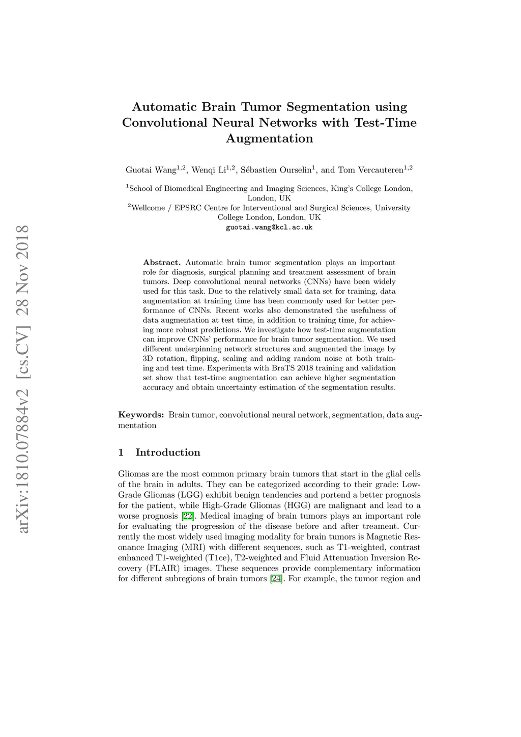 Automatic brain tumor segmentation plays an important role for diagnosis, surgical planning and treatment assessment of brain tumors. Deep convolutional neural networks (CNNs) have been widely used for this task. Due to the relatively small data set for training, data augmentation at training time has been commonly used for better performance of CNNs. Recent works also demonstrated the usefulness of using augmentation at test time, in addition to training time, for achieving more robust predictions. We investigate how test-time augmentation can improve CNNs' performance for brain tumor segmentation. We used different underpinning network structures and augmented the image by 3D rotation, flipping, scaling and adding random noise at both training and test time. Experiments with BraTS 2018 training and validation set show that test-time augmentation helps to improve the brain tumor segmentation accuracy and obtain uncertainty estimation of the segmentation results.