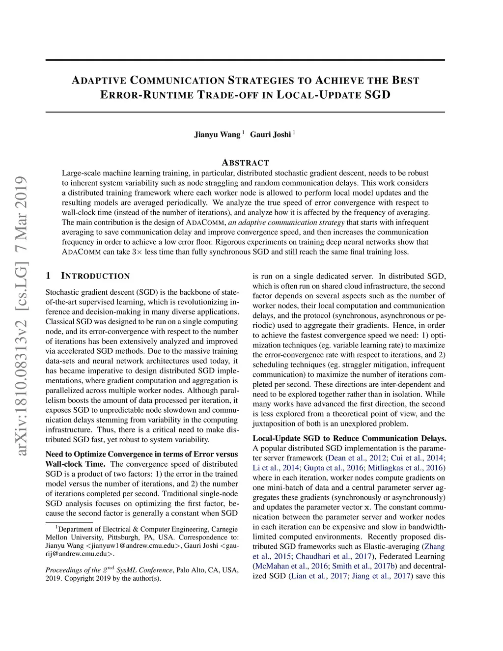 Large-scale machine learning training, in particular distributed stochastic gradient descent, needs to be robust to inherent system variability such as node straggling and random communication delays. This work considers a distributed training framework where each worker node is allowed to perform local model updates and the resulting models are averaged periodically. We analyze the true speed of error convergence with respect to wall-clock time (instead of the number of iterations), and analyze how it is affected by the frequency of averaging. The main contribution is the design of AdaComm, an adaptive communication strategy that starts with infrequent averaging to save communication delay and improve convergence speed, and then increases the communication frequency in order to achieve a low error floor. Rigorous experiments on training deep neural networks show that AdaComm can take 3×3 \times less time than fully synchronous SGD, and still reach the same final training loss.
