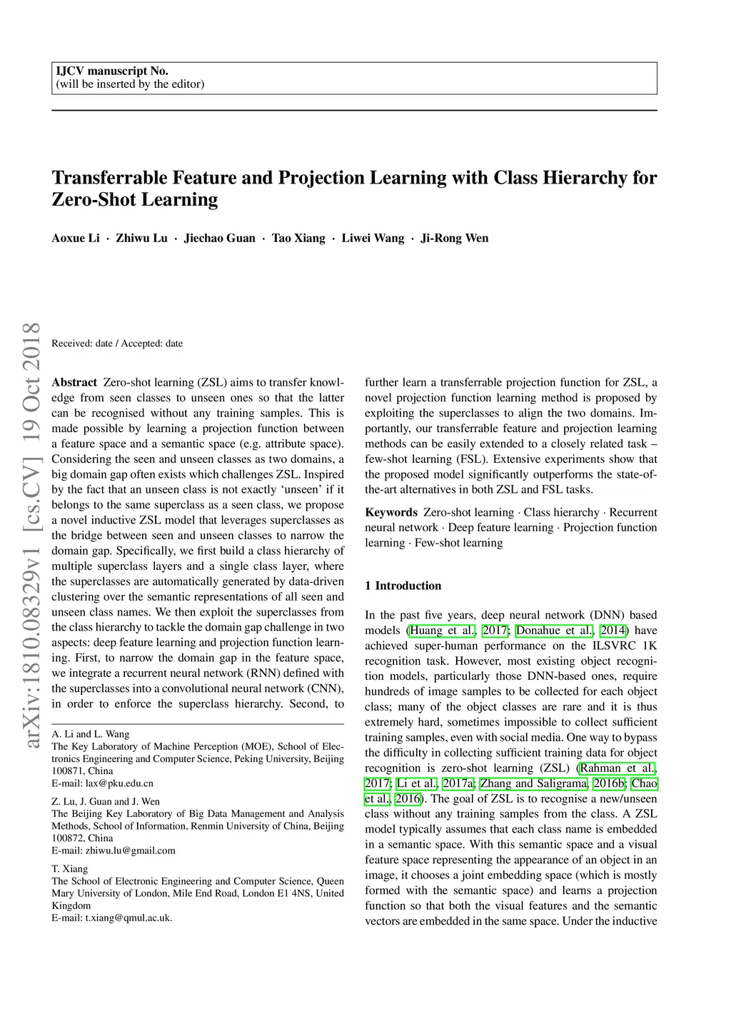 Zero-shot learning (ZSL) aims to transfer knowledge from seen classes to unseen ones so that the latter can be recognised without any training samples. This is made possible by learning a projection function between a feature space and a semantic space (e.g. attribute space). Considering the seen and unseen classes as two domains, a big domain gap often exists which challenges ZSL. Inspired by the fact that an unseen class is not exactly `unseen' if it belongs to the same superclass as a seen class, we propose a novel inductive ZSL model that leverages superclasses as the bridge between seen and unseen classes to narrow the domain gap. Specifically, we first build a class hierarchy of multiple superclass layers and a single class layer, where the superclasses are automatically generated by data-driven clustering over the semantic representations of all seen and unseen class names. We then exploit the superclasses from the class hierarchy to tackle the domain gap challenge in two aspects: deep feature learning and projection function learning. First, to narrow the domain gap in the feature space, we integrate a recurrent neural network (RNN) defined with the superclasses into a convolutional neural network (CNN), in order to enforce the superclass hierarchy. Second, to further learn a transferrable projection function for ZSL, a novel projection function learning method is proposed by exploiting the superclasses to align the two domains. Importantly, our transferrable feature and projection learning methods can be easily extended to a closely related task -- few-shot learning (FSL). Extensive experiments show that the proposed model significantly outperforms the state-of-the-art alternatives in both ZSL and FSL tasks.